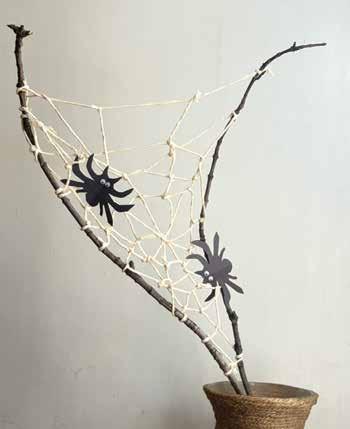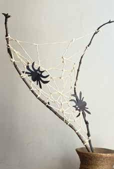 What you need: One or two sturdy branches (dry twigs from the yard work great), a tall vase or jar, white string, yarn, or twine, and a small toy or crafted spider.