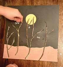 What you need: Black construction paper or cardstock, small twigs from outside, glue, yellow paper (for the moon), brown paper (for the ground), and small googly eyes.