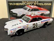 PERHAPS THE MOST EXCLUSIVE die-cast car in this piece comes from Dave Richardson, showing off an old David Pearson die-cast. It is his 1971 Mercury Cyclone for Wood Brothers Racing, the car for which the Silver Fox was best known. Check out the sleek autograph on the windshield to top off this impressive car.