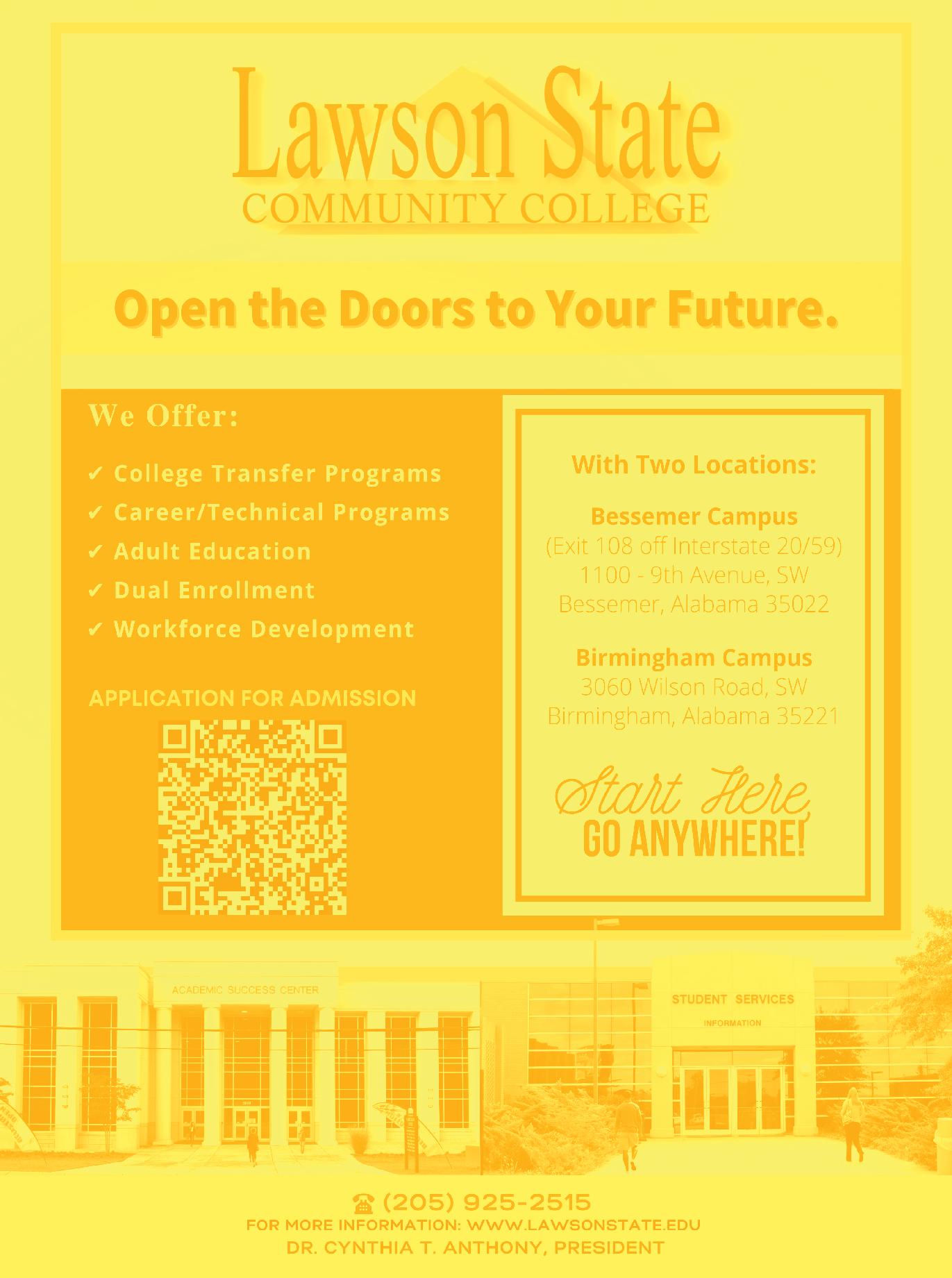 FOR MORE INFORMATION VISIT: LAWSONSTATE.EDU Bessemer Campus (Exit 108 off Interstate 20/59) 1100 - 9th Avenue, SW Bessemer, Alabama 35002 Birmingham Campus 3060 Wilson Road, SW Birmingham, Alabama 35221 START HERE GO ANYWHERE