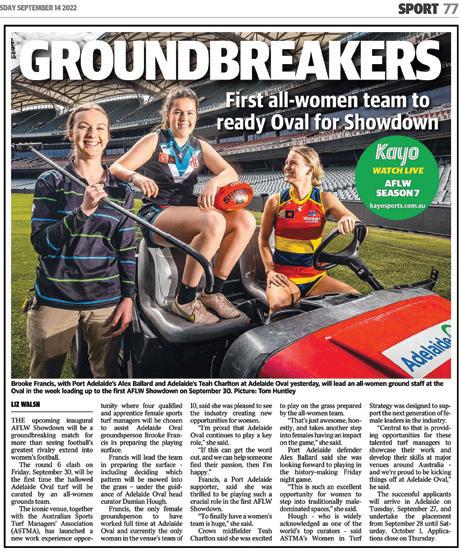 Images/Daniel Pockett – ICC FEATURES World Cup balancing act 16 Back in session - 2022 FTMI 22 AFLW crew break new ground 28 ALSO IN THIS EDITION… Foreword Thinking 4 Best on ground – Socials 6 Women in Turf Profile – Sophie Warren 34 Regional Profile – Dunsborough Lakes GC, WA 58 Around the Trade 64 Association Reports 68