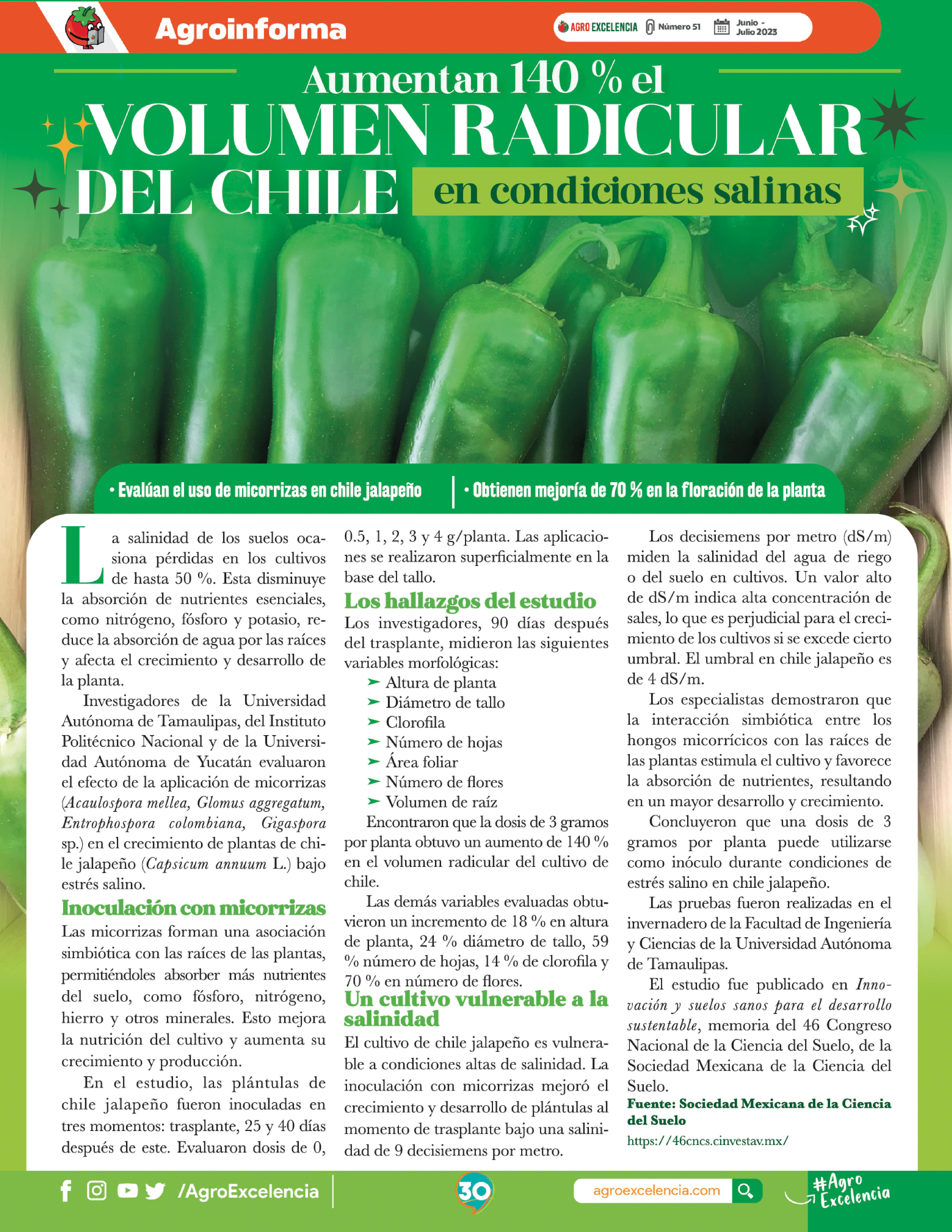 Un ejemplo es el uso de Rhizophagus intraradices. Especialistas del Inifap encontraron que las plantas inoculadas de chiles poblanos con esta micorriza mejoran 35 % su producción, con un aumento del tamaño del fruto en 5 %, y peso, en 17 % (“Cómo mejorar en 35 % la producción de chile”. 2023. Revista Agro Excelencia, Boletín electrónico 131).