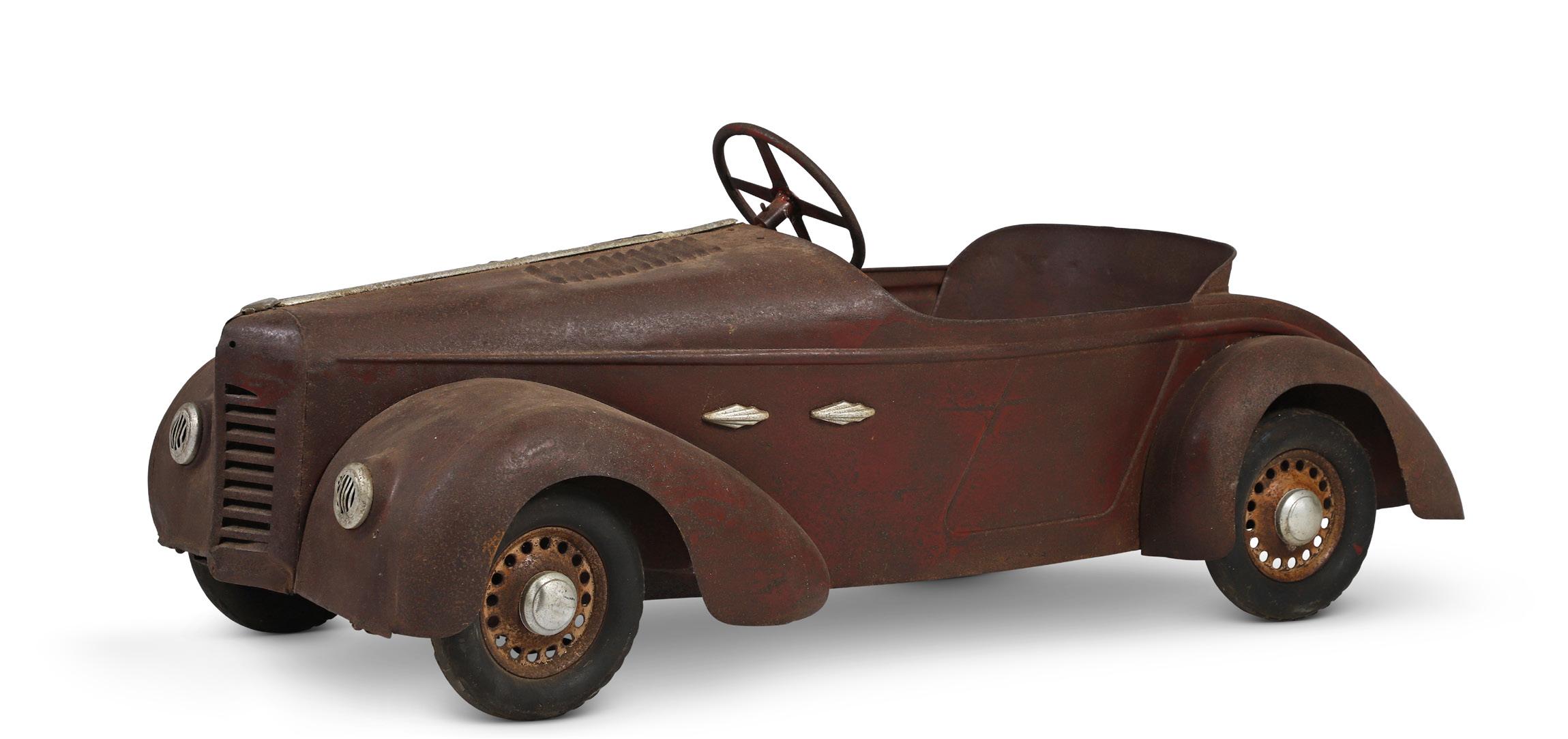 And if you're reading these lines now, it's because you share the same passion, the same quest, the same desire as Dominique T., who has spent 30 years of his life accumulating all these things, looking for the rare object, the missing can, the extra enamelled plate, the painted sheet never seen before... For Dominique T., this passion and these years of frenetic research began with a car, an MGB, then a gift from his wife, Ketty. An almost insignificant gift, an enamelled plate. But not just any enamel plate, a Goodrich featuring a child stylised by the speed painter Geo Ham. A rare, sought-after and highly-rated plate. A beautiful object. The beginning of a bulimic quest for the rare and the beautiful. In the background, a passion for Citroën, and the advertising genius of the visionary André of the same name, or pedal cars, with at the top this pair of Eureka Grand Prix, Bugatti versions, found separately, and whose serial numbers follow one another...