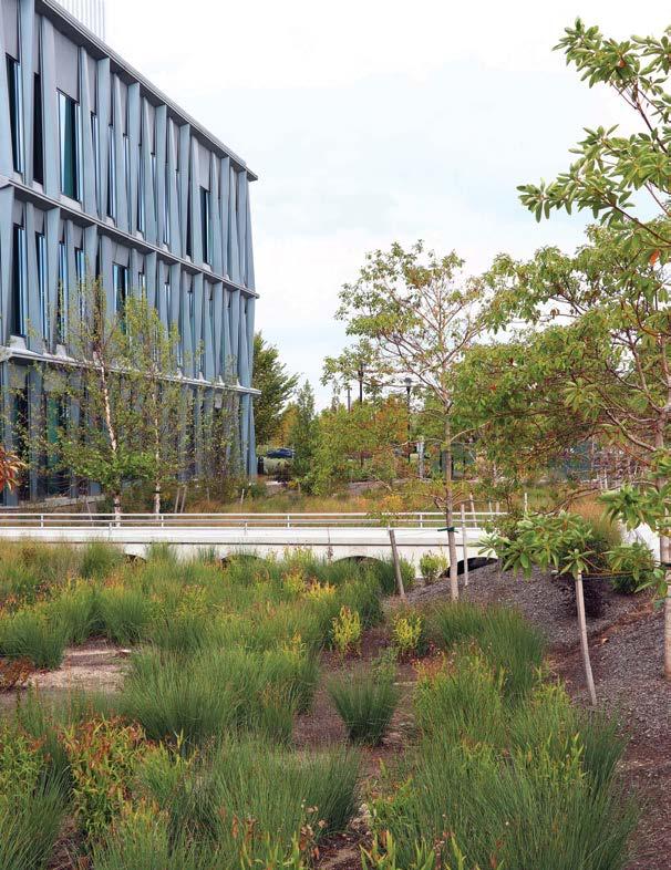The north entry plaza uses a unique mix of bluestone quarried in northeastern Pennsylvania. Flanking the pavers is an artistic arrangement of crushed bluestone of varying sizes, made from by-product waste material, mixed with linear bands of cut bluestone. Retaining the slightly elevated entry plaza are blackened stainless steel retaining walls with integrated lighting. The blackening process results in a living finish that will patina over time. Similar to the north entry plaza, the perimeter of the building is mulched with the crushed bluestone by-product waste material, creating a distinctive look in contrast to surrounding landscapes that use conventional hardwood mulch. ■