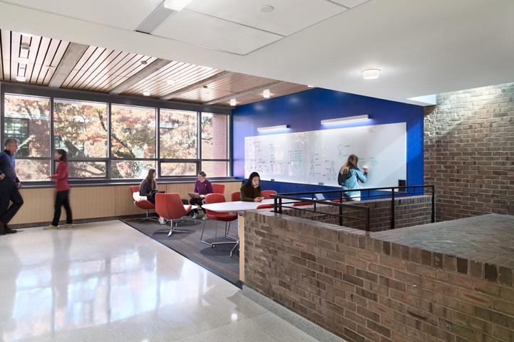 The LEED silver rated design also replaced failing brick and obsolete windows with a highly insulated brick veneer and curtain wall envelope. The material choices and colors for the new envelope respect the unique geometry of Pei’s original design while lightening and brightening the material palette. This transformed exterior presents a welcoming façade composed of innovative, contemporary building systems appropriate for the 21st century academic environment. l