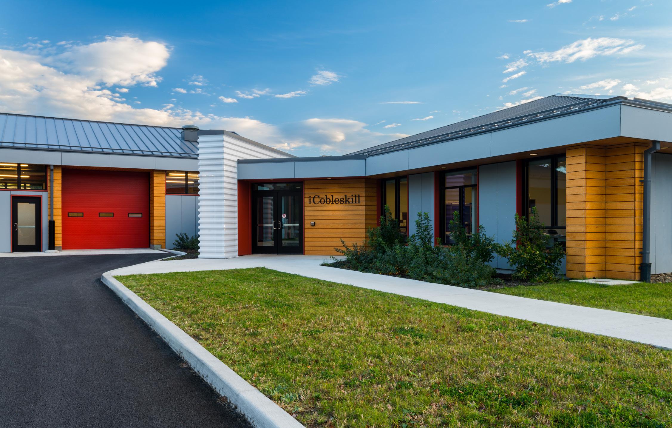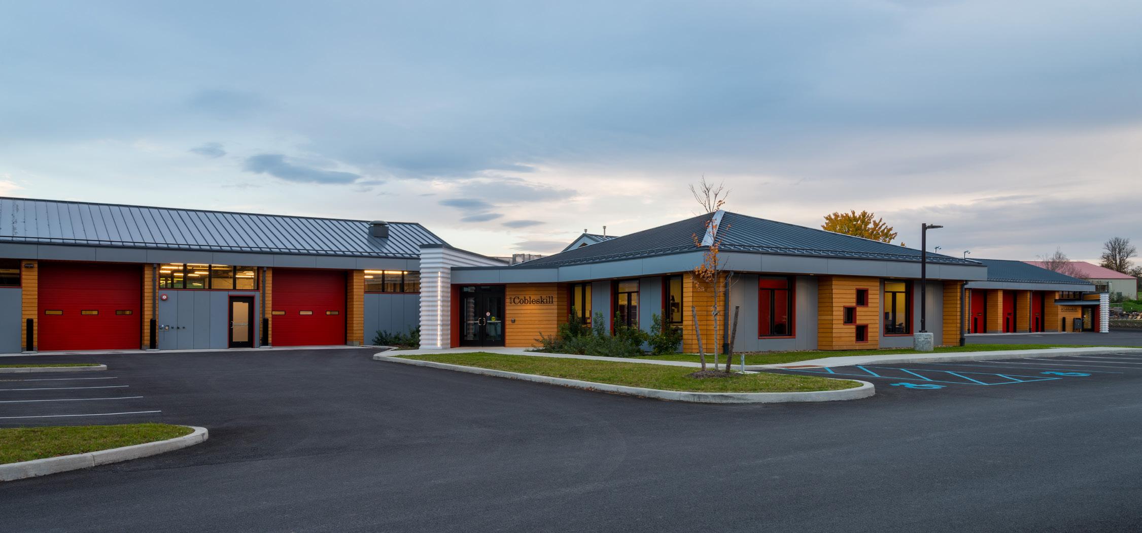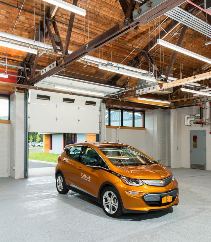 A6.7 million dollar renovation project on the modern SUNY Cobleskill campus set out to elevate the presence and function of the outdated Mackey Facilities Complex, which houses the team that keeps the campus functioning and looking beautiful. Marked by a “Pizza Hut” roofline, the nondescript building had seen no improvements since it was constructed in 1967. The project had three goals: stabilize the building envelope, replace aging mechanical systems, and improve the layout and function of the complex. With a focus on sustainability, the project team started with the decision to reconstruct the existing building, rather than demolish it and build a new one. The facility’s exterior was reskinned in a palette that harmonizes with the campus aesthetic, punctuated with Cobleskill orange. The awkward roofline was redefined, and original tongue-and-groove roof planks were salvaged and reused on shop ceilings. The primary entrance to the complex is now easily located and