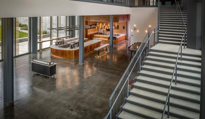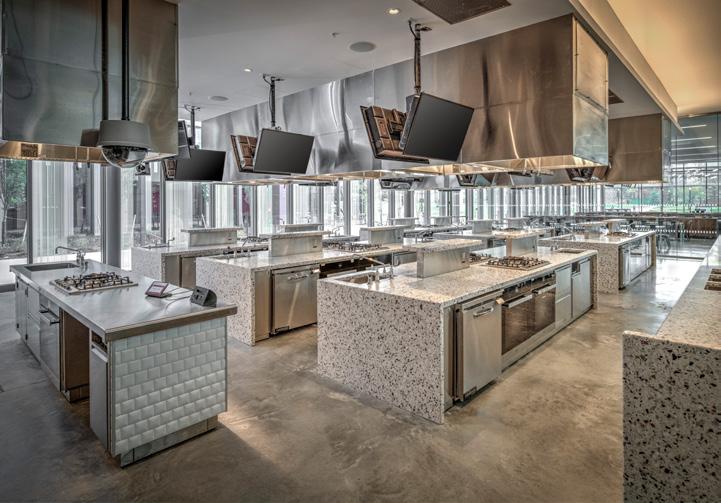 Essential to growing North Campus is a 1,000 seat dining hall that offers a variety of micro restaurant style serveries. The dining hall includes state-of-the-art equipment, sloping wood and plaster ceilings, modern lighting, and an allglass Discovery Kitchen with 24 teaching stations used for academic classes and Cornell dining.
