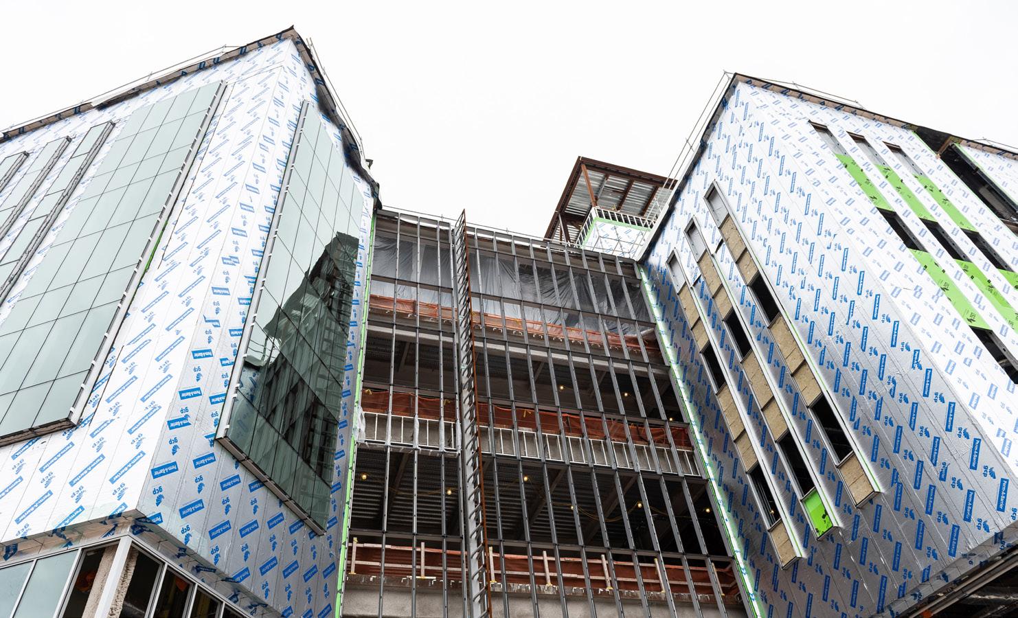 The entire building was reclad, enclosed in a continuous blanket of spray foam insulation, with R-values ranging from twenty to twenty-seven. The original building was introverted, with no defined entrance and little reason for people to interact with it unless they had business there. Now, with dynamic cladding, large expanses of glazing, and a new grand entrance, the entire community is invited inside.