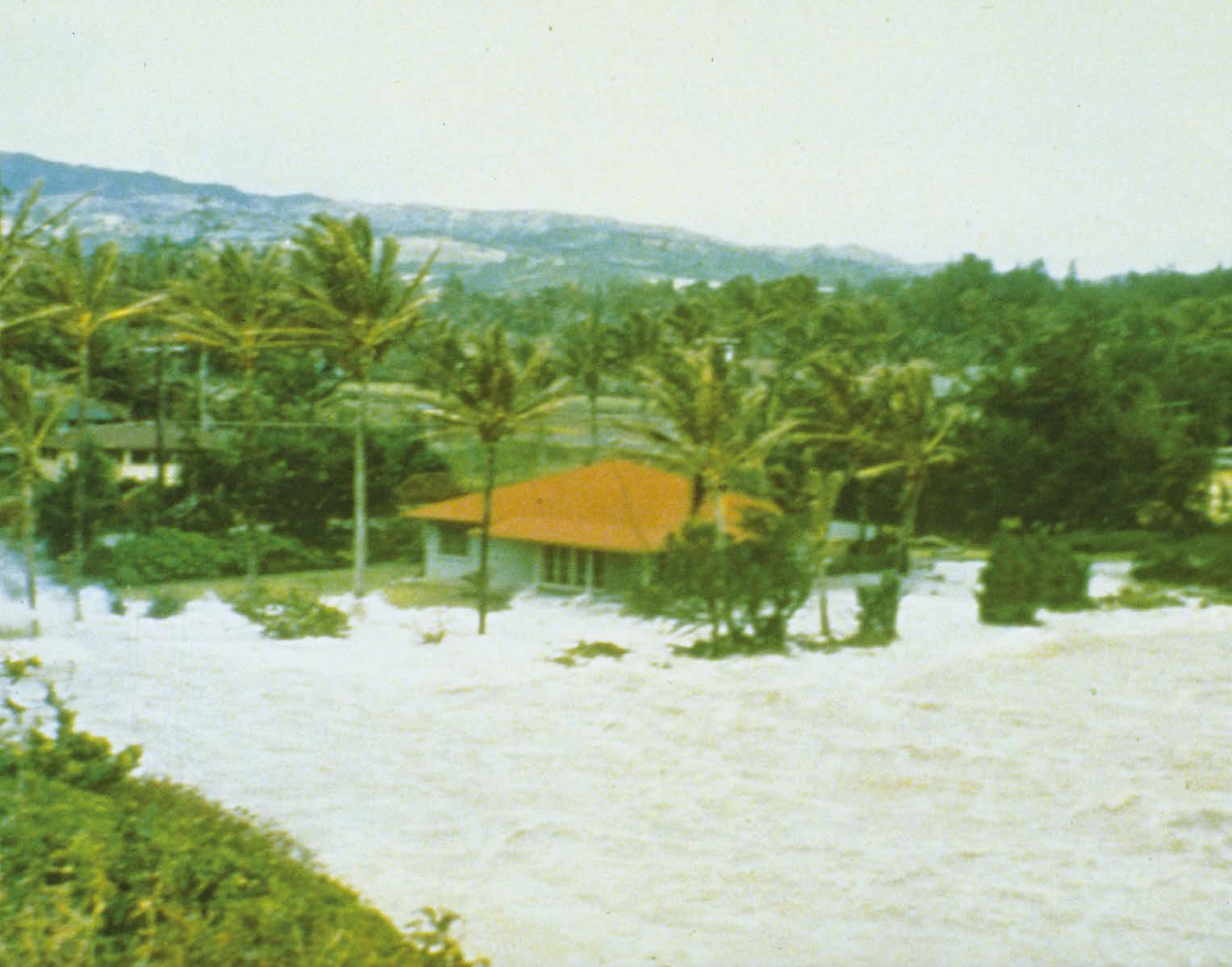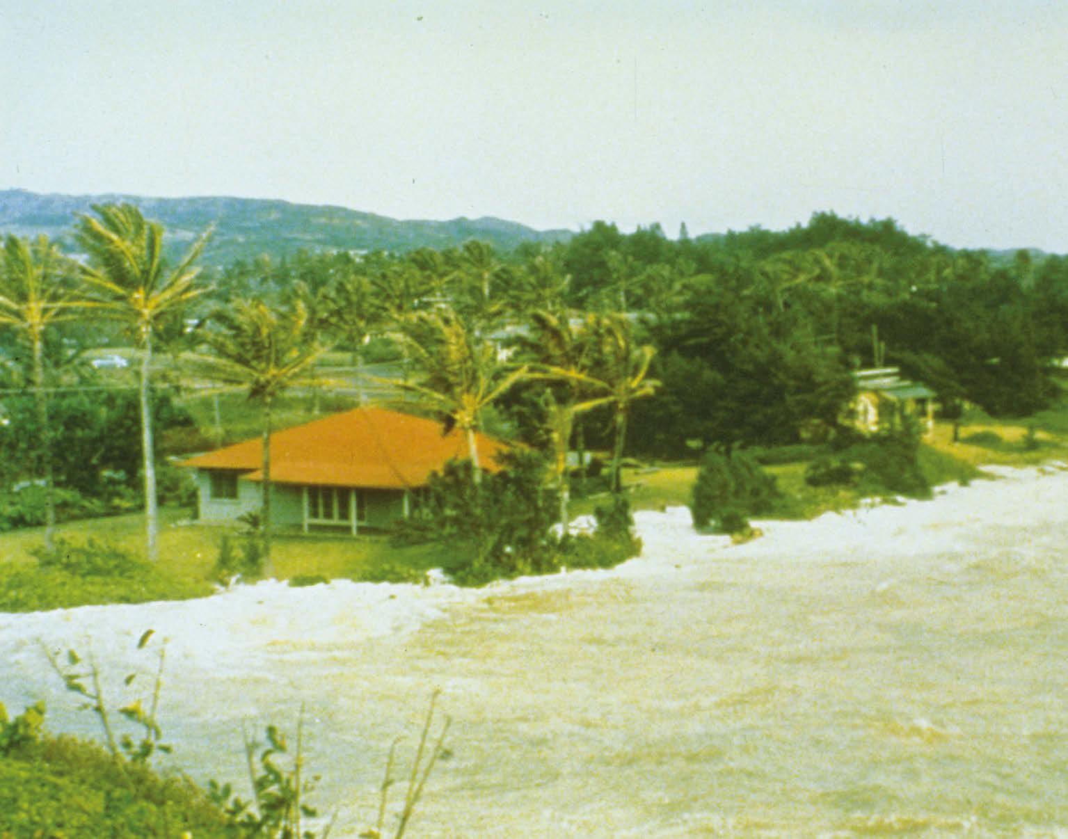 left: These three sequential photos show the arrival of a major wave on March 9, 1957, at Laie Point on Oahu. A magnitude 8.6 earthquake south of the Andreanof Islands in the Aleutian Islands generated the tsunami, which also impacted Kauai.
