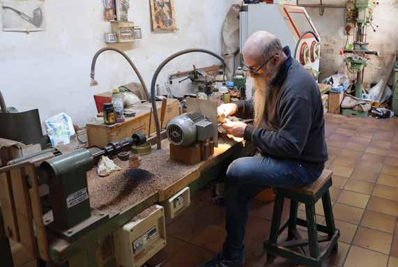 Their workshop is sandwiched into the narrow lanes of the historic town centre and can only be described as tiny. There’s just enough room to squeeze in a lathe, a bandsaw, and a limited array of other tools. The whole place is covered in briar shavings and sawdust, redolent with the alluring scent of wood. The space dedicated to the “shop” part is even tinier, comprising a cabinet packed with pipes of every size, shape and colour and a chest of drawers to gladden the heart of any self-respecting collector, with its painstakingly organised array of spare pipe parts.