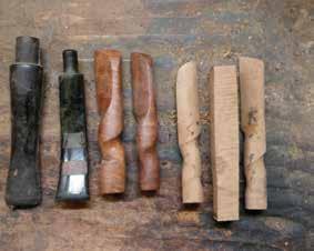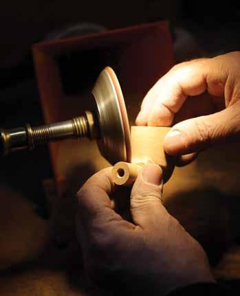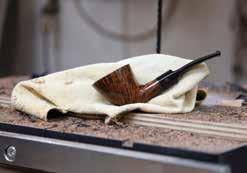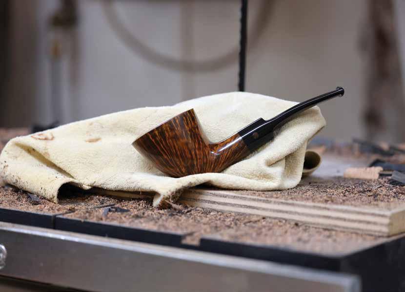 from Calabria, seasoned for several years before use to eliminate unpleasant odours and leave only that typical briar scent so sought after by connoisseurs. In the workshop the resulting blocks of wood are treated with all the reverence of diamonds of the first water, but with a soupcon of bated breath, because any defects are only discovered during carving and disappointments are not unknown. Then there are the pipes in bog oak, made from semi-fossilised oak found in peat bogs. These sable beauties are as magnificent as they are difficult to carve, but have the advantage of remaining strictly neutral when smoked, thus preserving the pure flavour of the tobacco.