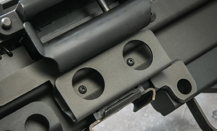 motor too. An integrated electronic cutout battery protection unit is included and the ‘C’ rating of your battery should be appropriate to its overall capacity, although the butt stock storage compartment will limit your options to some extent. The internals reflect the same attention to detail as the excellent looking externals; the gearbox is the latest design, and the DX variant even sports fully CNC machined gears over the typical offerings used in the standard version and other products, ensuring superb smooth running and durability especially considering the additional load of the recoil hammer unit and ammo belt.