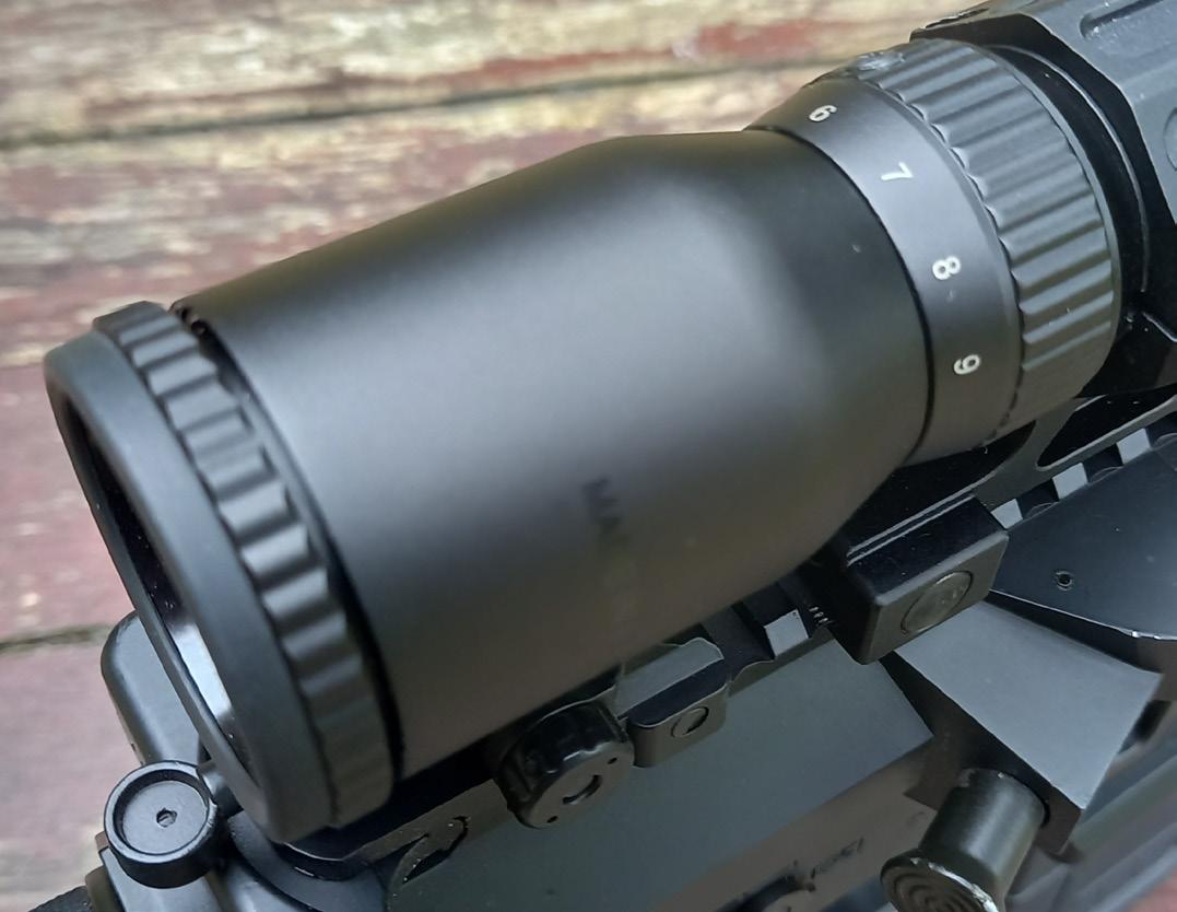 In use I loved this scope! Although the objective bell is sizeable it sits neatly on top of the rifle, and all the controls are extremely easy to use. Windage and elevation are simple given the clearly marked graduations on the turrets, and the magnification adjustment ring is both smooth and positive. The illumination adjustment is equally smooth, lighting up the super-clear central cross of the reticle in five levels each of red/ green brightness. Overall this is an optic that I know I will regret sending back as “the steels they were a clangin’” all afternoon with this bad boi in place atop the gasser!