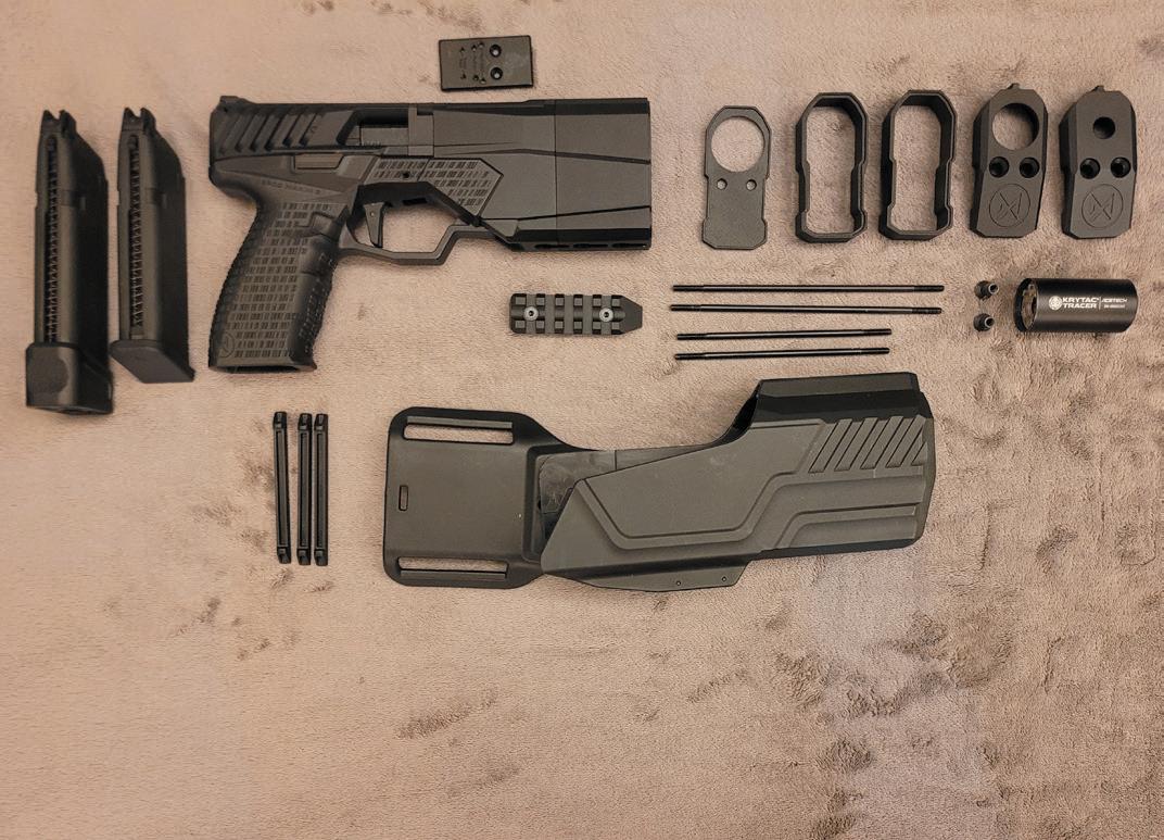 The deployment case arrived in a nicely finished card outer liner, while the case itself is a very well presented semi-rigid zip closure affair akin to a high quality camera case or drone carry bag and emblazoned with ‘KRYTAC’ and the famous squid logo. Unzipping the case and lifting the lid you are confronted with a menagerie of components alongside the pistol and holster, as the deployment pack includes one each of the green gas and CO2 capsule powered magazines, another reason for the slight delay in the release, according to uncle Allen, as they wanted to make sure the CO2 magazines were functioning optimally and the trigger also presented some earlier problems; it’s reassuring to know that they took their time to get everything spot on, rather than rush to release and have any fallout.
