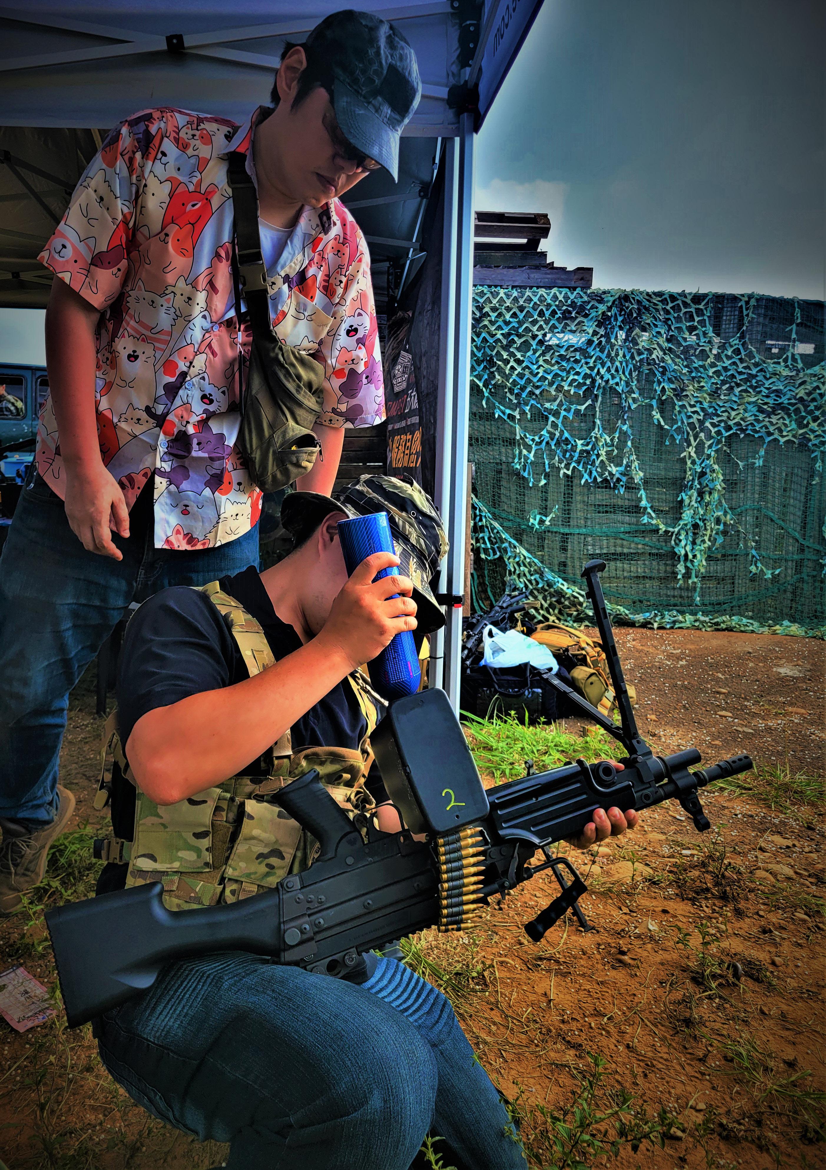 I awoke typically early on the Saturday; thankfully I had booked the day off work at least, but nonetheless had to get moving on my usual timescale, heading to Taipei main station and jumping on the 09:00 high speed rail to Taichung, where I had time for a leisurely sit down breakfast and stocked up on water and snacks for the blistering heat of Taiwan’s more southerly heartland. Eric from TMC Taipei soon arrived to pick me up and drive me the remainder of the way to the site, where I met with the usual handsome guys of domestic youtube fame; the 4UADSmartAirsoft crew in the shape of Andrew, Jess and Luis were already getting involved in their usual videography exploits alongside JeffTheKid as our good friends from VFC had brought along not one but five of their latest M249 GBB LMG prototypes in an array of configurations for some heavy duty in the field testing! This was to be carried out by the staff on site, and allowed the players to get hands on with them to try them out in a range setting as well as even trading usage of them for in-game-token-elements to try and help tip the balance of firepower for their particular team or groups assaulting actions throughout the weekend.