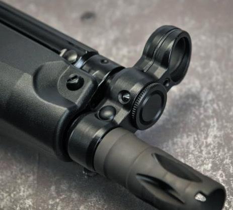 The front sight is the typical enclosed ring around a fixed front post, along with the small front sling hook loop protruding left out of its base; as usual your mileage may vary slinging up using it, I tend to just single point sling most of my guns for my situations using the longer extended loop neatly welded to the rear body plug that carries the telescopic stock. This is itself released from the fully closed or open position by a leftward press on the swinging paddle beneath the stock stanchions as is usually the case on such things. The rear sight is the typical HK drum-style rotary selection of V-notch for up close and varying hole sizes for longer ranges, all of which can be adjusted for windage with the vertical screw at its rear that can be loosened, the turret shifted left or right, then retightened to hold it firm.