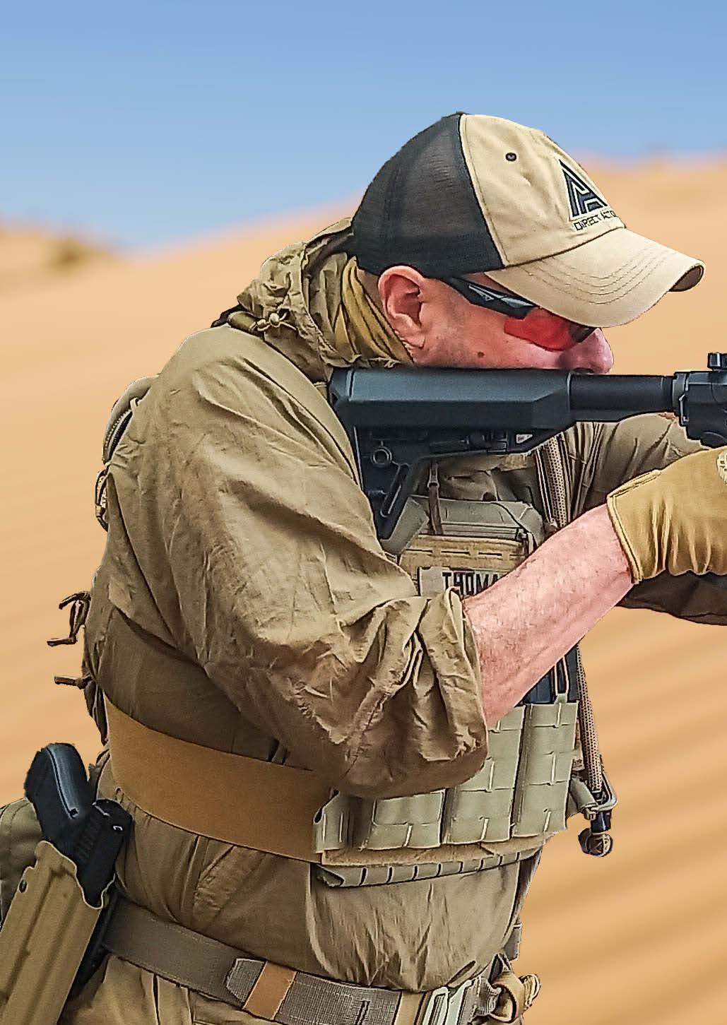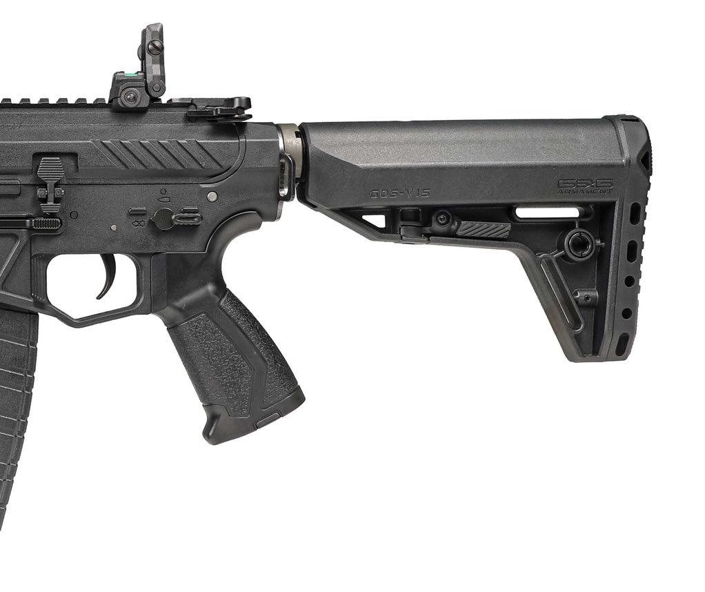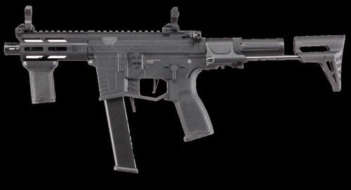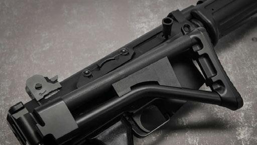 With a very rigid but easily extended telescopic stanchion stock which can be pulled out in a swift motion during deployment, and that can also be closed easily with gravity assist and the one handed actuation of its underside release button, as well as the convenient ambidextrous controls, the APC also has M-LOK/Picatinny adaptors on the short front section ahead of the vertical magazine well, a trilug adaptor for quick detach suppressor attachment or removal, as well as standard AR pistol grip interchangeability on later models as is becoming the standard for a lot of platforms to allow users to tailor