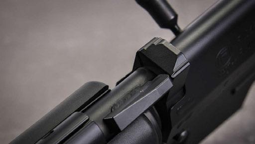 The monolithic upper receiver has a typical full length Picatinny adaptor rail for optics-mounting along with the supplied flip-up back-up iron sights which have pistol style sights on top in their stowed position and adjustable front blade and rear ghost ring when deployed, offering plenty of flexibility for sighting preferences to suit the use case. Of course the real steel equivalents all tend to ship with an Aimpoint red dot sight as a standard part of the package, an ACRO P1 or P2 looking right at home atop the small but powerful platform.