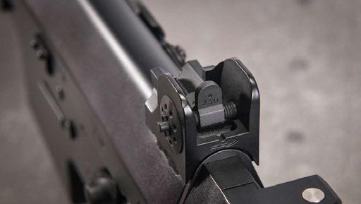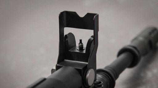 “THE MONOLITHIC UPPER RECEIVER HAS A TYPICAL FULL LENGTH PICATINNY ADAPTOR RAIL FOR OPTICS-MOUNTING ALONG WITH THE SUPPLIED FLIP-UP BACKUP IRON SIGHTS WHICH HAVE PISTOL STYLE SIGHTS ON TOP IN THEIR STOWED POSITION AND ADJUSTABLE FRONT BLADE AND REAR GHOST RING WHEN DEPLOYED, OFFERING PLENTY OF FLEXIBILITY”