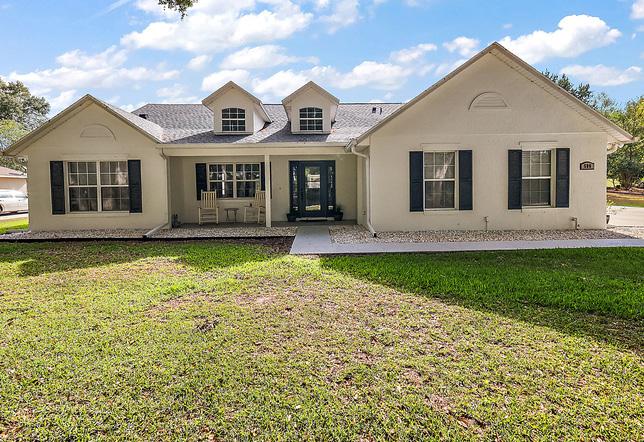 THIS HOME HAS A CHARMING PORCH, etched front door, large driveway, gutters, roof 2021, AC 2016, hot-water heater 2022, water softener 2022 all of this time and more just a short golf cart ride to the clubhouse. Walk into your formal living room and dining room, continue through the arched doorways which lead you to the kitchen, with newer stainless steel appliances and the perfect open kitchen and living room concept for entertainment. Both the formal living room and family room have access to your large FL room just through the sliding glass doors. Master and 2 bedrooms are on the main level with a split floor plan. The Master has 3 walk-in closets, walk in shower in master bath and raised sinks. The 4th bedroom opens up to the Bonus room upstairs which has endless possibilities especially with the wet bar. This space could be great for a pool table, card room, craft room, in-home theater, or the perfect area for your guest and grandkids. On the main level there is an interior laundry room with washer, dryer, and overhead shelving. And are you surprised to hear that even the garage is oversized?! MLS# G5063743 // $455,000.