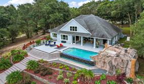 ELEGANT LUXURY at its finest in this executive LAKE MYRTLE POOL house on approximately 4.14 acres gated and fenced. You will appreciate the privacy this house offers as you drive through the gate and up to the circular driveway. Upon entering the glass front doors, you will immediately be impressed by the infinity edge grotto pool, views of Lake Myrtle, and the upgraded finishes. This open floorplan has 10-foot ceilings and crown molding throughout the house with porcelain tile floors everywhere but the guest rooms. The formal dining room has 12-foot ceilings, and is open to the formal living room with a lake front window, custom beams and stone-faced fireplace. In the great room you will enjoy entertaining or relaxing with spectacular lake and pool views. The kitchen has granite countertops, custom wood cabinets, an island with sink, 6 burner stove with pasta faucet, and a closet pantry with antique doors. The gourmet kitchen is open to the dining space and great room with sliding doors that lead to the remote-controlled screened lanai and waterfall grotto pool. This resort style pool has a bar and slide, facing the lake to create the endless water perspective with large veranda and patio. Triple-tiered landscaping accents the walk to Lake Myrtle. The owner’s suite has a custom beamed ceiling and is very spacious with French doors that lead to the lanai and pool. On your way to the owner’s bath are His and Her’s closets that also have 10-foot ceilings and double doors. The owner’s bath has a private water closet, dual sinks with granite countertop, linen closet, spa tub, and a zero-clearance seamless glass shower, and walk in closets. Directly off the kitchen is the laundry room with custom cabinets, 10-foot ceilings, and storage. The fourth bedroom is hidden behind a secret bookshelf door with its own private bath and kitchenette. Built in 2016 with a private well, Rinnai water system, whole house propane generator, two in-ground owned 1000 gallons and 500 gallons propane tanks and an extra 220 outlet in the over-sized two car garage with workspace for your bench, tools and more. For even more storage put items in 1092 square foot utility shed.