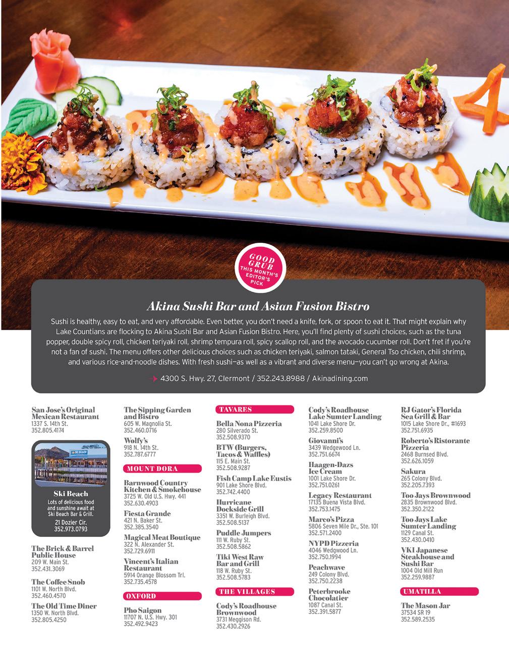 HOT SPOT: Looking for a hot place to take visitors from out of state? Consider the Tiki Bar & Grill at Lake Minneola Inn on the banks of Lake Minneola. It o ers something most local restaurants don’t–a Key West-style atmosphere with gorgeous lake views and opportunities for a little fun in the sun. In addition to great food, visitors can swim at a beach area, feed a school of giant cat sh, or simply sit back and watch boats gracefully glide across the lake.