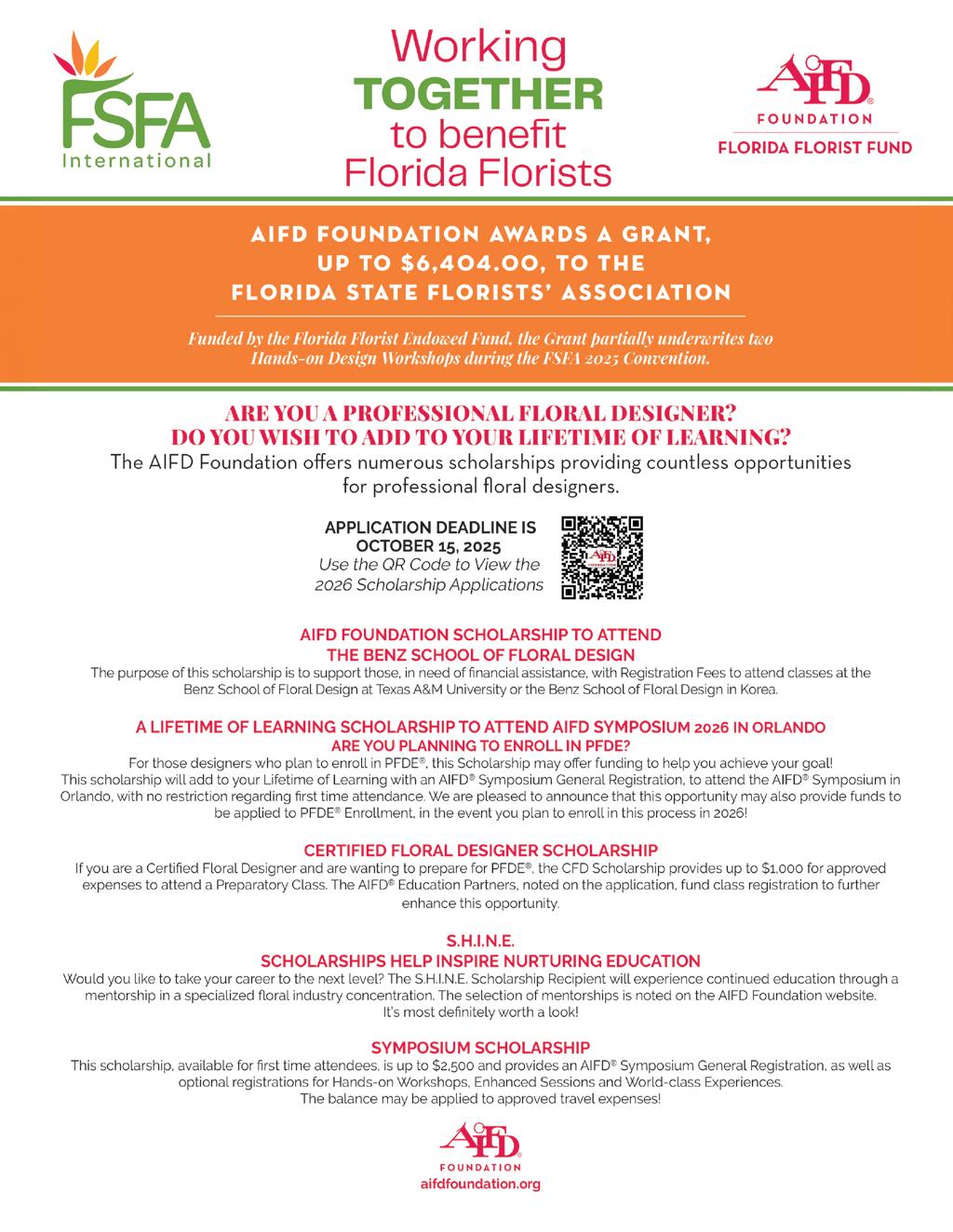 maintain and enhance the program. The organization is investing donated funds for long-term sustainability. This year's donation enables the FSFA Scholarship Program to continue supporting future floral professionals.