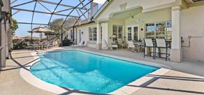 You’ll be welcomed by an inviting front porch and elegant double doors that open into a spacious great room/dining area, complete with a gas log fireplace and custom shelving. The generously sized den/office or formal living room offers versatility to suit your needs. The kitchen boasts ample cabinet space, snack bar, and a cozy breakfast area. The primary suite features a tray ceiling with double crown molding, His/Her walk-in closets, separate raised vanities, a glass walk-in shower, a water closet, and a luxurious soaking tub with soothing jets. French doors open up to the lanai, providing direct access to the screened-in pool, complete with a built-in spa. A convenient tri-split plan leads to bedroom 2, accompanied by a guest bath featuring a tub/ shower combo and a single vanity. Bedroom 3 boasts a walk-in closet and its own private bath with tub/shower and single vanity. Bedroom 4 offers a deep walk-in closet and private access to the pool bath, which features an oversized shower, dual shower-heads, a raised vanity, and a French door leading to the lanai/pool area. This home is adorned with granite countertops, soaring volume and tray ceilings, crown molding, 8 ft. interior doors, and tile floors throughout (no carpet!). The interior laundry room features custom cabinets and a stainless steel sink. MLS# G5068943 // $850,000.