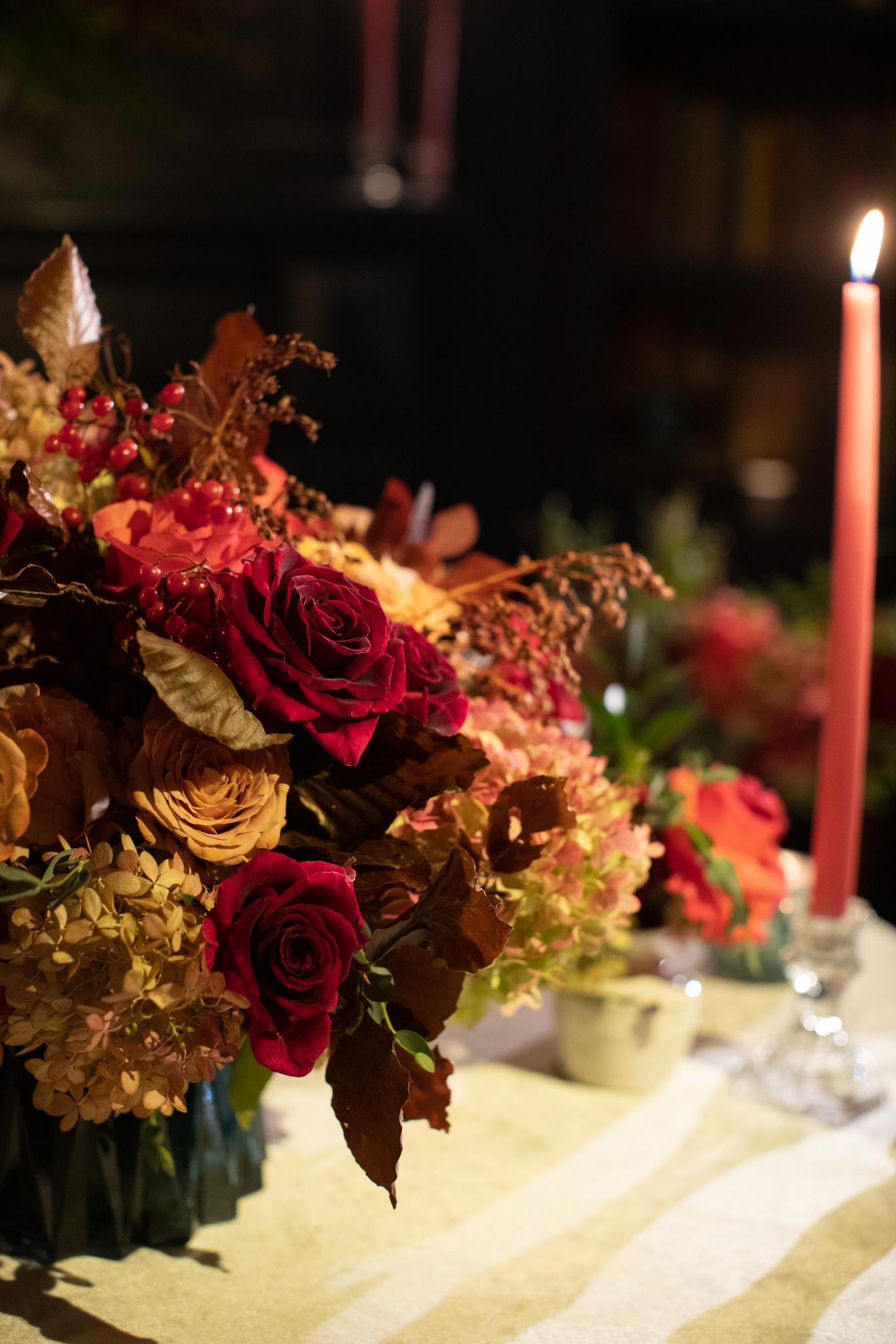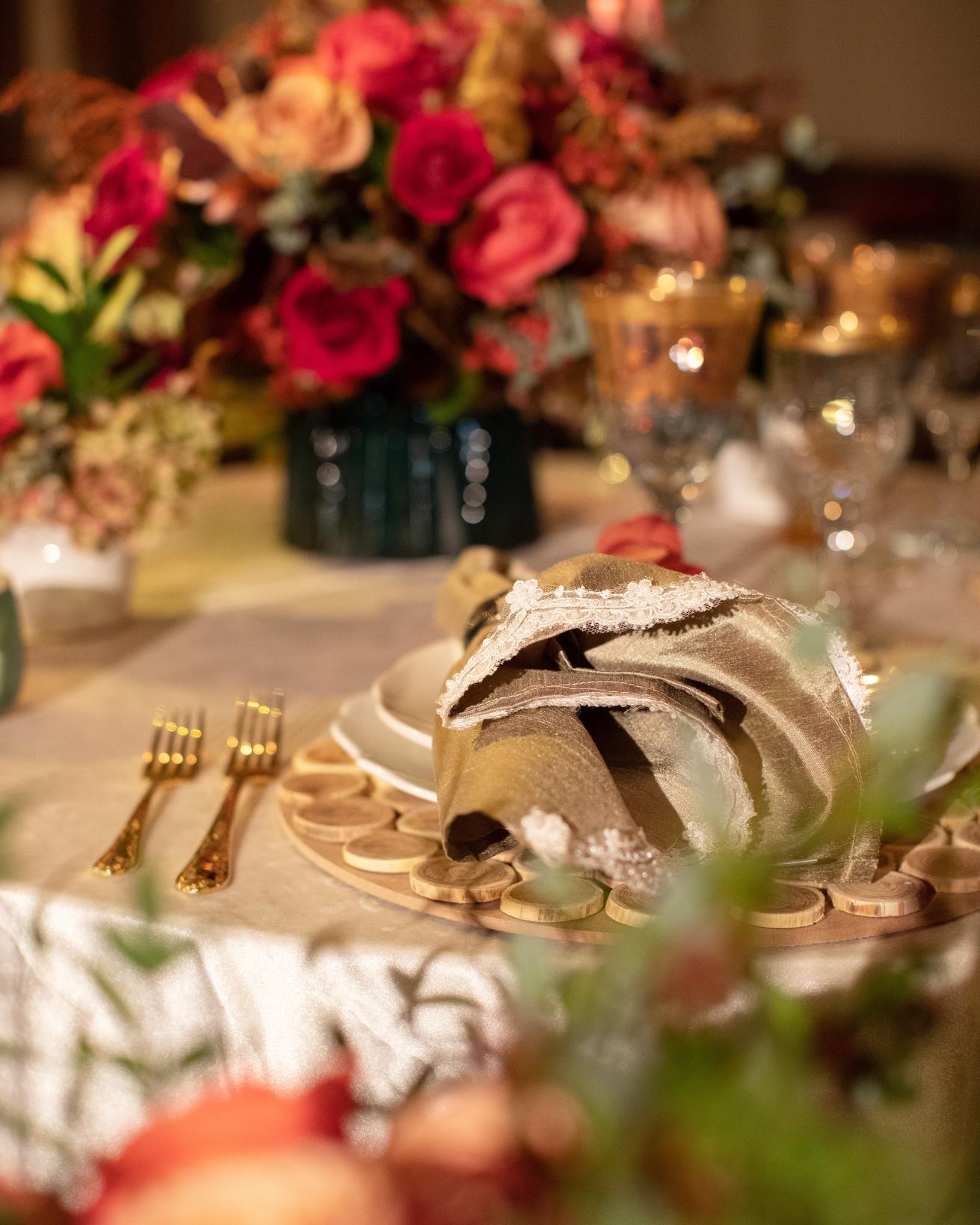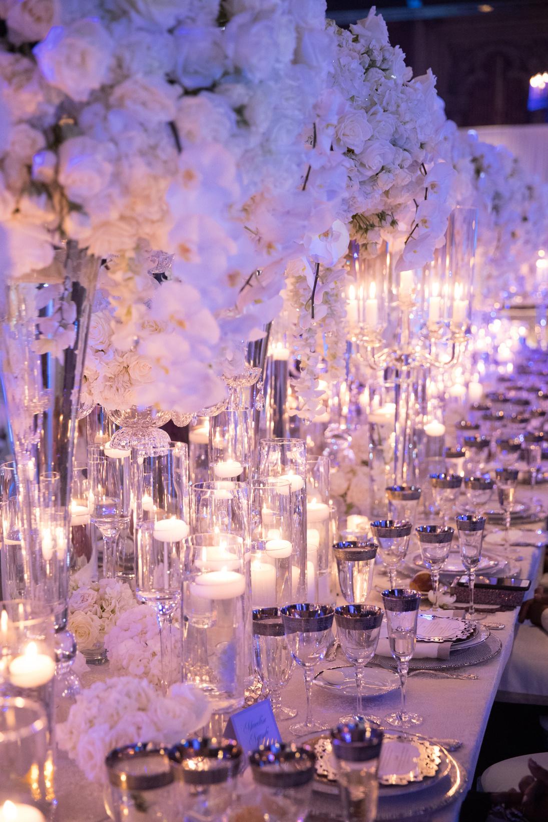 Make a statement with layers of grand floral arrangement, candles and beautiful textured fabric for your table linens and napkins.