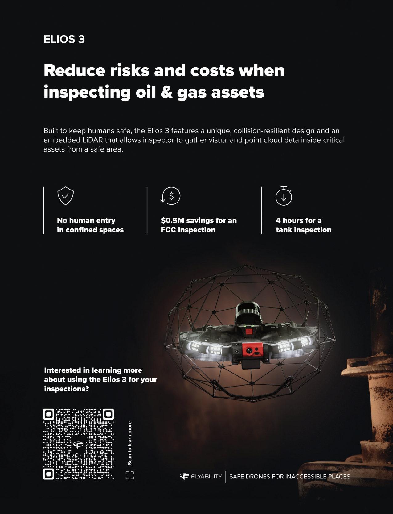 Safety. Safety is a primary reason for using drones for inspections of assets in oil and gas. The Elios 3 drone is equipped with special flight technology and a protective cage to ensure the drone can move with confidence around and inside complex assets. By sending the drone inside a tank, it gathers data without having to send someone inside confined spaces or hazardous environments. The collisiontolerant drone collects both visual and LiDAR data, giving a full picture of the asset.