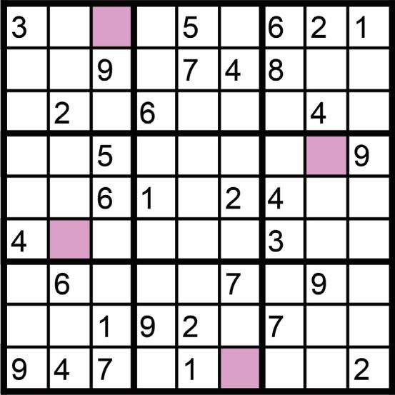 Fill in all the squares in the grid so that each row, column and each of the 3 x 3 squares contains the digits 1-9.