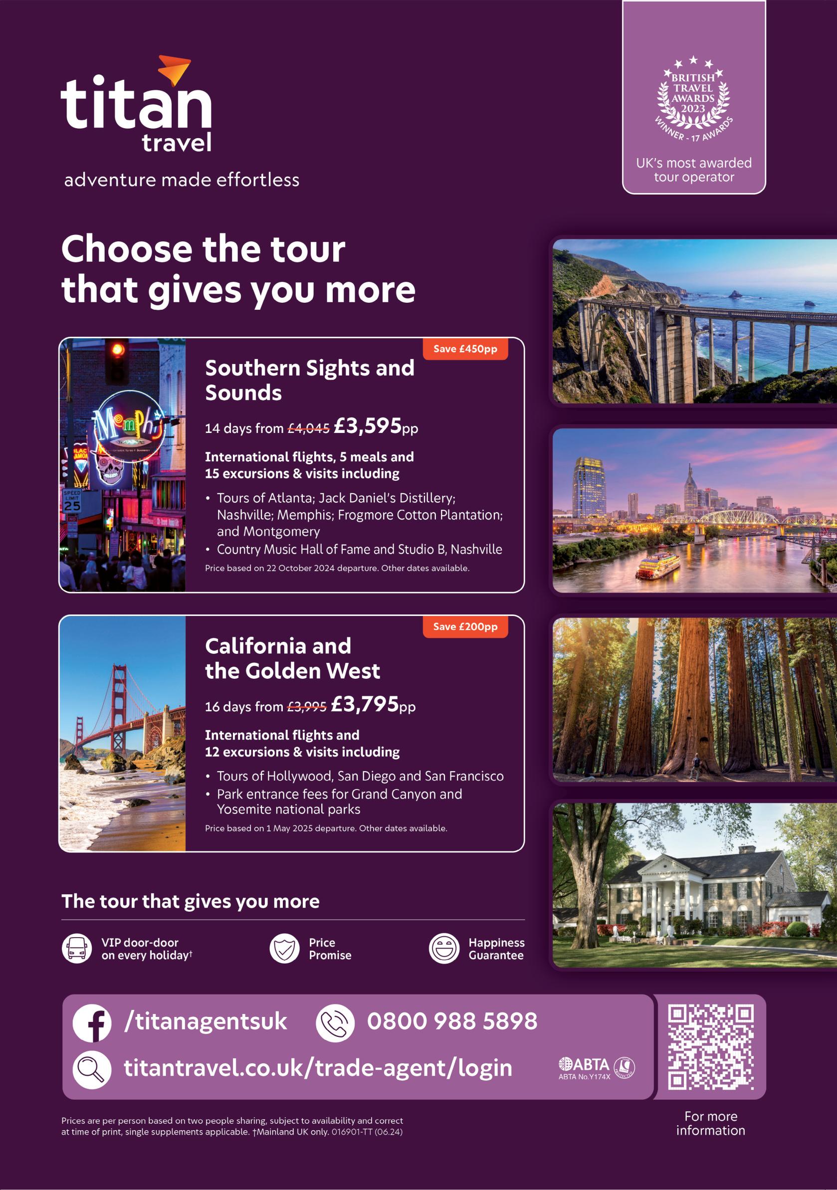 Other options to the USA include ‘Southern Sights and Sounds’, a 14day option starting from £5,145 for a February 2025 departure. www.titantravel.co.uk