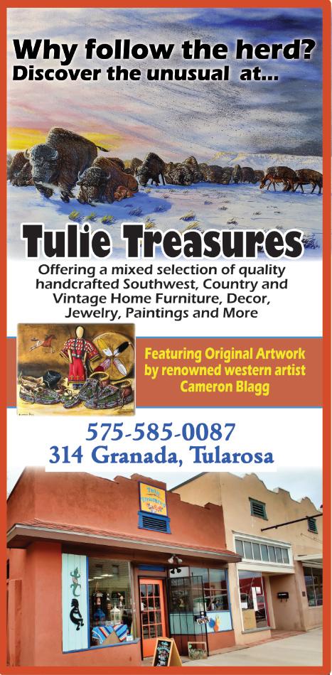 TodayBlock50,Lots1-4, servesamoresoberingpurpose asthehomeoftheTularosa BasinMuseumofHistory. Whatwasoncethetown’sonly barnowhousesthemuseum’s bookstoreandgiftshop.Down thehallfromthereliesdisplays coveringNativeAmerican artifacts,fossilsdiscoveredin thelocalarea,andthehistory