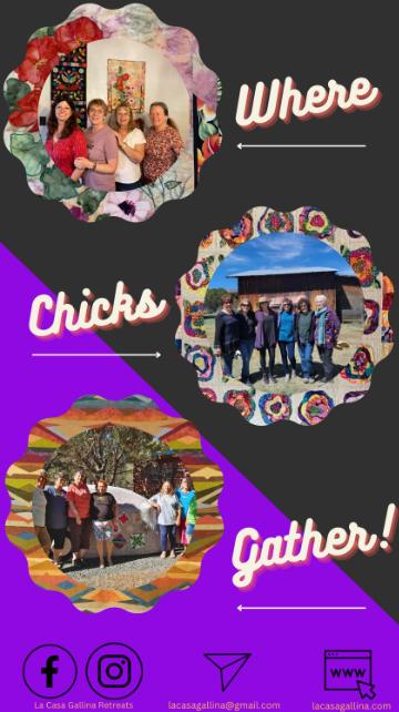 La Casa Gallina Retreats is the brainchild of owner Cathy Gormley. Cathy moved to the Ruidoso area in late 2020 with the idea of opening a bed and breakfast style facility catering to artists and makers of all kinds. Cathy named the house La Casa Gallina (the hen house) based on a large vintage sign from an old fried chicken franchise that hangs on the side of the barn. “I felt it led to a perfect motto…La Casa Gallina, where Chicks Gather”said Cathy. “We have hosted all kinds of ladies who are quilters, knitters and fiber artists.” The large cabin is nestled in the Lincoln National Forest on 3 acres of land that offers the guests great views, peace and tranquility while being pampered with superb meals and comfortable accommodations. With 3 guests bedrooms and a cozy sewing room, we are able to host up to 6 guests. So what makes Casa Gallina different from other retreat facilities? Perhaps it’s the comfy beds covered in charming quilts or the delicious