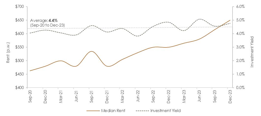 The chart below indicates the blended median annual sale price per square metre for all sales throughout the sale period between 2020 and 2024 (year to date).
