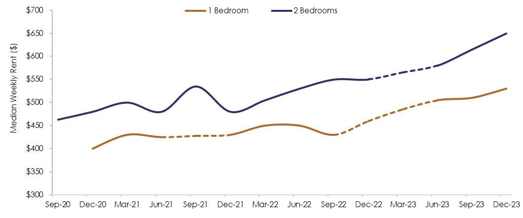 Houses are the dominant dwelling typology in Edmondson Park, although since the introduction of apartment stock the most notable rental activity in recent years has been for two-bedroom apartments. Two-bedroom apartments have been popular with investors given comparatively low buy-in price points coupled with high rental returns. In fact, rents for twobedroom dwellings across all typologies reviewed are typically highest for apartments. There are limited one-bedroom rental properties in Edmondson Park and even fewer three-bedroom apartments.