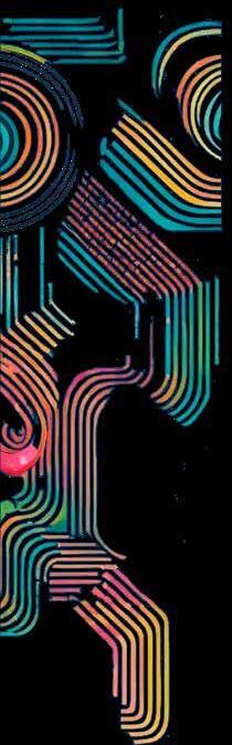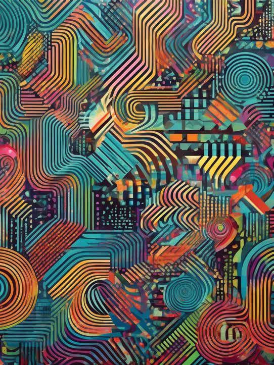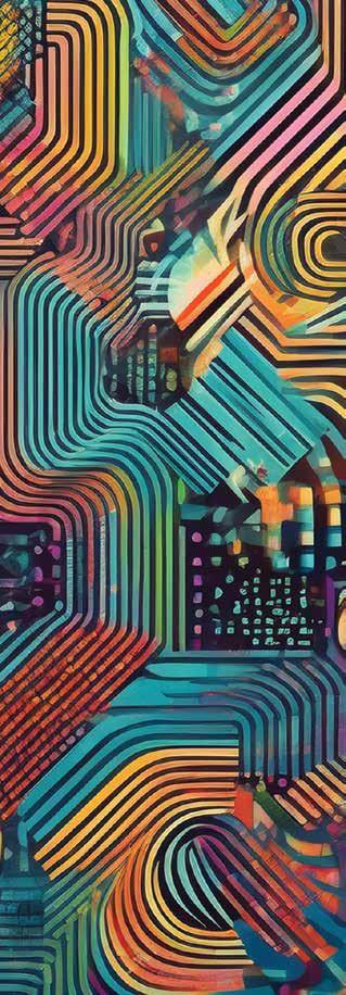 A threshold is crossed. For the first time on the cover of Alaska Business , the design incorporates material procedurally generated by computer, colloquially known as AI. Art director Monica Sterchi-Lowman used Photoshop AI to combine a plain blue Top 49ers logotype with a reference image: a profile of a human face. Not a single eye or nose remains, but the portrait contributed the colored stripes resembling circuitry. Ironically, the human’s intent was to emulate “organic art” inspired by magazine covers of the ‘60s and ‘70s.