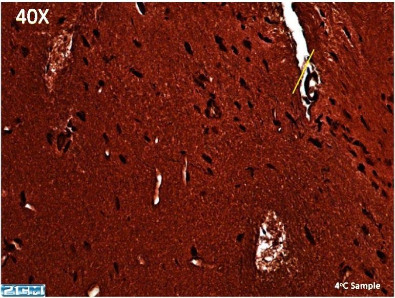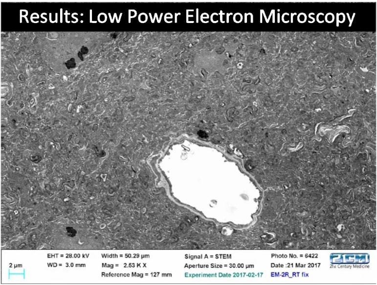 The second sacrifice that Doctor Coles had to have, in just having his brain removed from its skull so it could be photographed all the way around for cracks, is that it had to be biopsied several times. This was so we could test for the ice formation tendency of the brain and for the ability of his brain to take up cryoprotective agents. But also, perhaps most critically, it was so we could look, for the first time, at the structure of a human cryopatient's brain after preparation for cryonics, both at the light and the electron microscopic level. Our ultimate goal was publishing the results in a scientific journal. Now, there's an interesting wrinkle to that last part because Dr Coles wanted to be a co-author on the paper. [Laughter.] So I promised him that would happen [Slide 3]