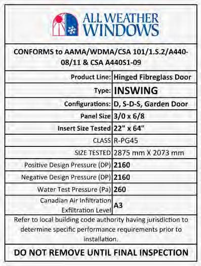 allweatherwindows.com WEB allweatherwindowscanada FACEBOOK awwcanada INSTAGRAM @AWWCanada TWITTER All Weather Windows LINKEDIN create inspire TOLL-FREE CANADA 800.638.5709 CALGARY 888.932.3387 EDMONTON 800.232.9407 LETHBRIDGE 877.327.0701 RED DEER 855.348.0701 REGINA 888.672.2202 SASKATOON 800.589.9899 VANCOUVER 800.518.8338 WINNIPEG 800.892.5340 While All Weather Windows makes every effort to ensure that the information contained in this catalogue is accurate, we do not accept liability for any inaccuracies. This catalogue is subject to change, as well as errors and omissions, without notice or liability. Doors are provided unfinished/unstained and without hardware unless otherwise noted. All photos are for illustration purposes only and depicted door frames and windows may not represent All Weather Windows products. All Weather Windows® is a trademark of All Weather Windows Ltd. V3.5 002020.11.10.22 Printed locally in Edmonton, AB, Canada 2022