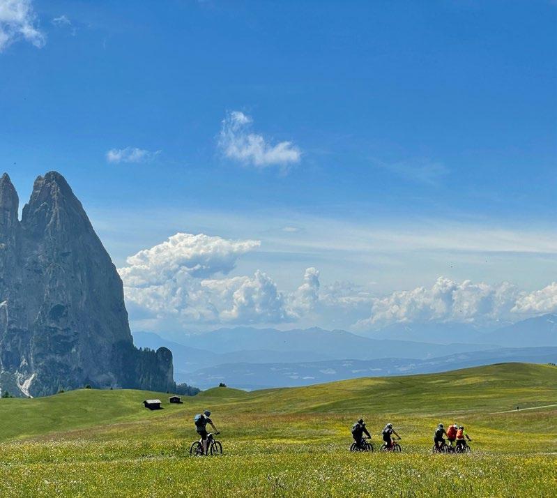 4. Tag Nach einem Einroller über 500 Höhenmeter bringt uns die Plose Bahn auf den 2000 Meter hohen Gipfel. Der Ausblick ist gigantisch. Auf wechselnden Wegen erreichen wir St. Magdalena. Der Blick von hier auf die Geisler Spitzen fehlt in keinem Südtirol-Bildband. Der klassische Aufstieg durch den Naturpark zur Brogles Alm ist ohne Schiebepas sage nicht zu meistern. Doch dafür entschädigt dann das Super-Panorama. Dolomiten at its best! Wir fliegen hinun ter ins Grödner Tal. Übernachtung im 3-Sterne-Hotel mit italienischer Küche. 43 km, 1750 hm