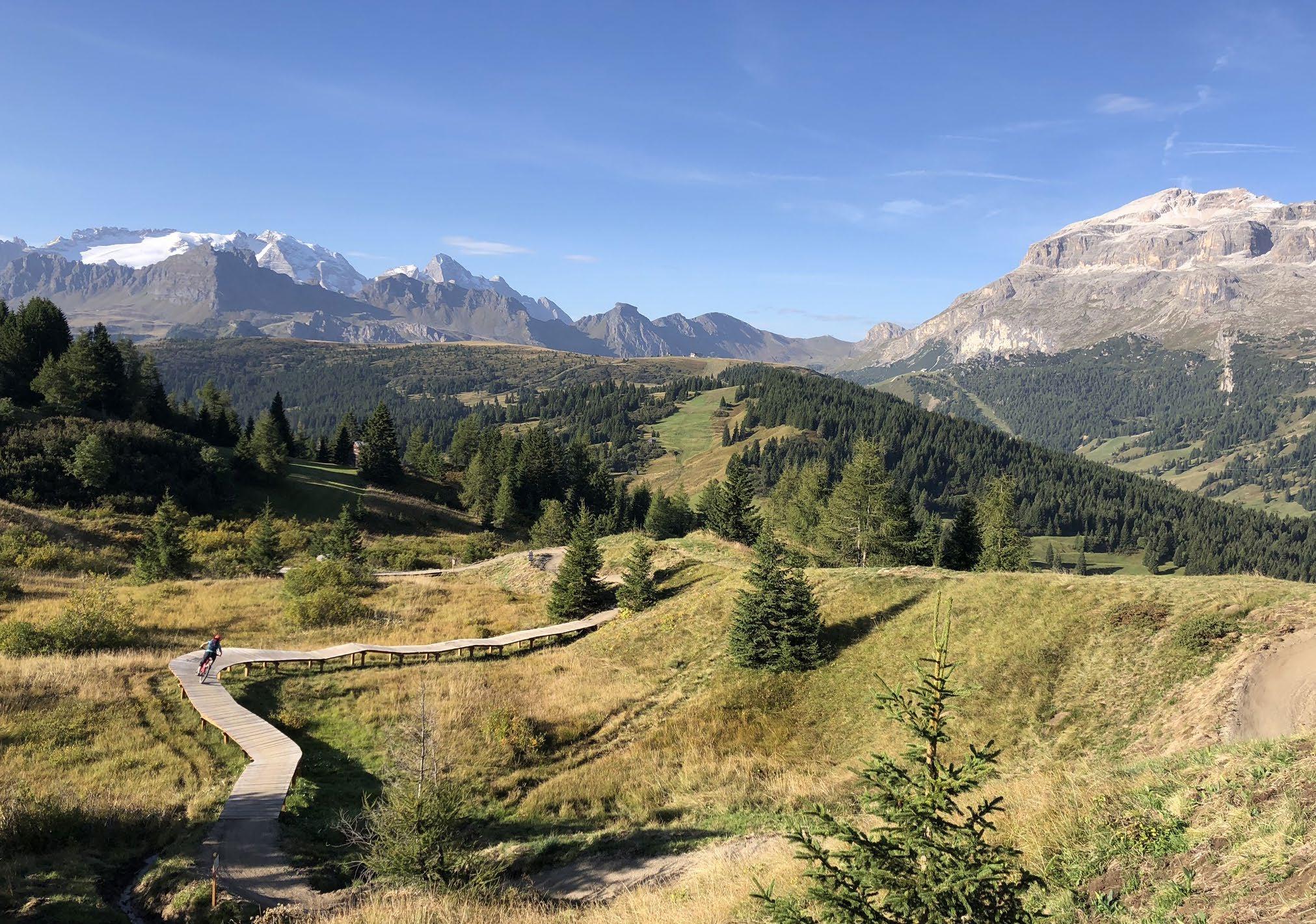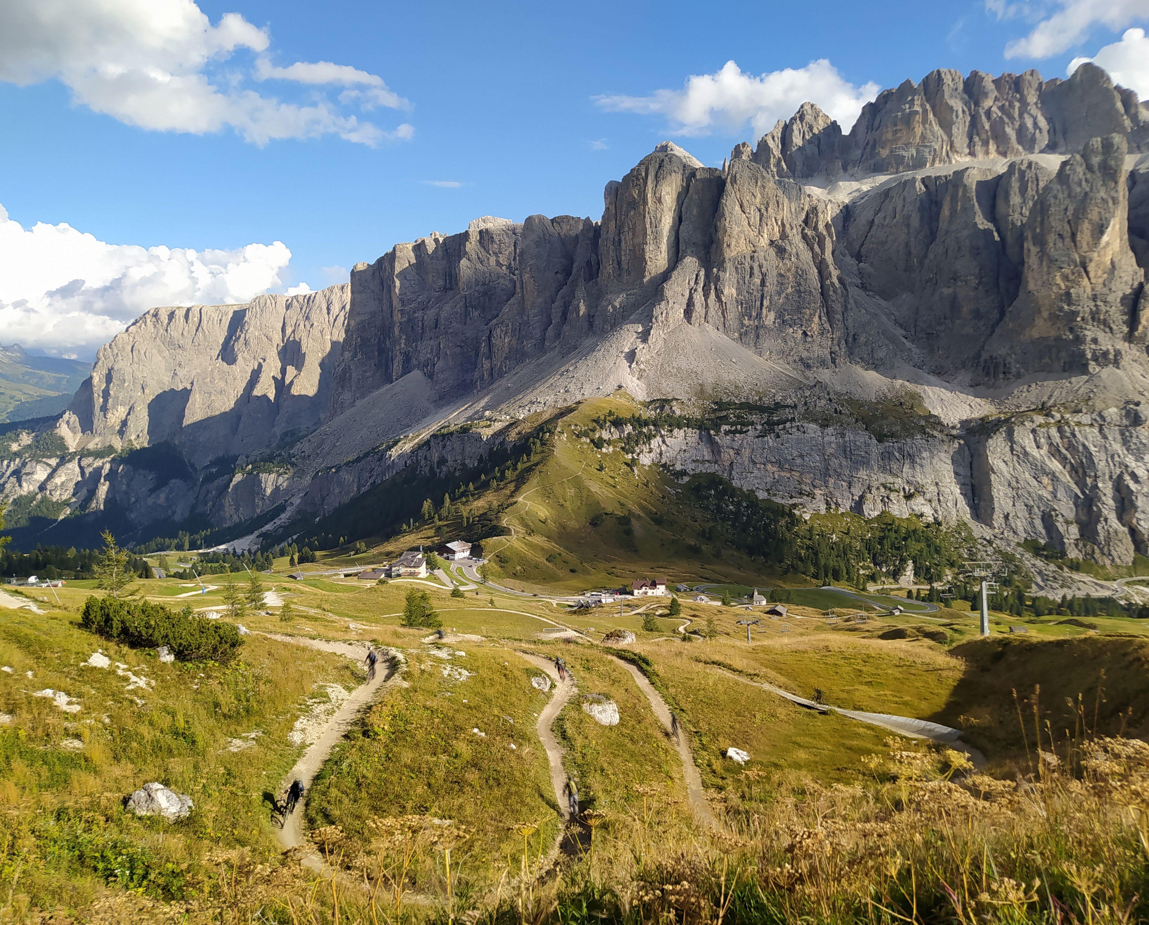 + 15.000 Tiefenmeter überwiegend auf Bikepark-Strecken und Naturtrails + Sella Ronda - wir biken direkt unter den Felstürmen