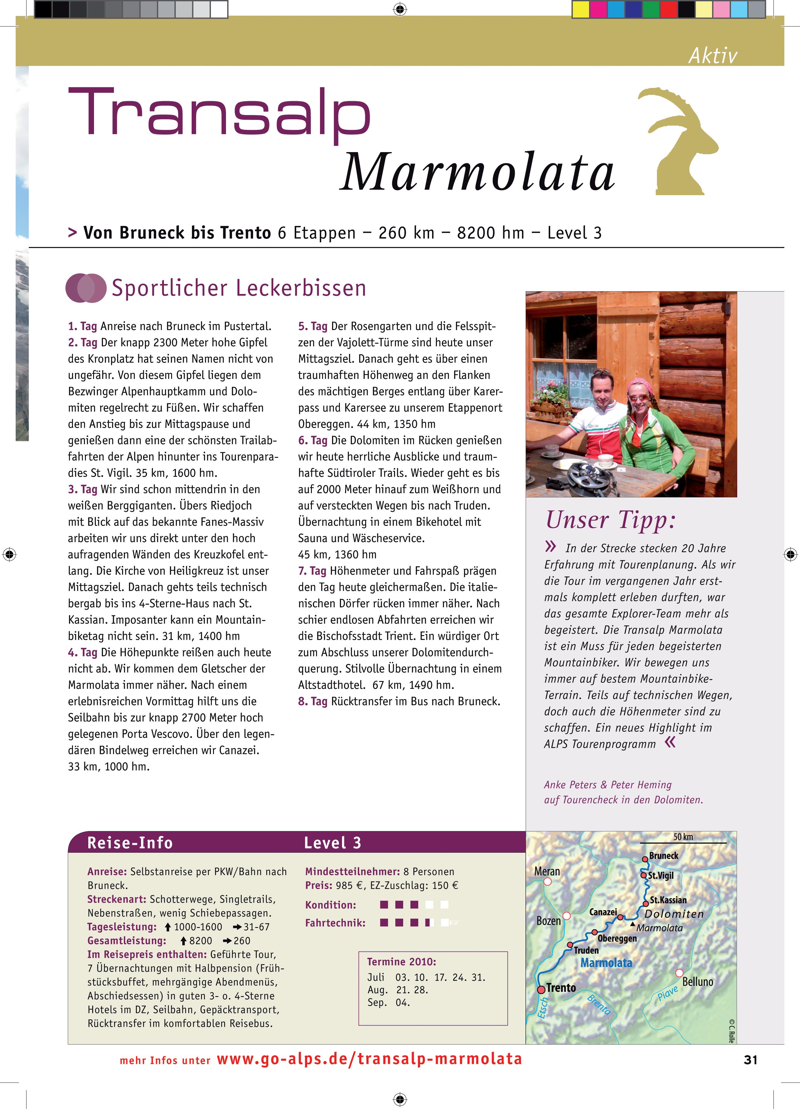 Juen, ALPS Guide» Die Transalp Latemar ist ein Muss für jeden Level-4Fan. Landschaft und Wege sind auf dieser Strecke ideal kombiniert. Dazu kom men durchweg gute Hotels. Obwohl wir zweimal die Seilbahn nutzen, verliert die Strecke nicht an Anspruch.