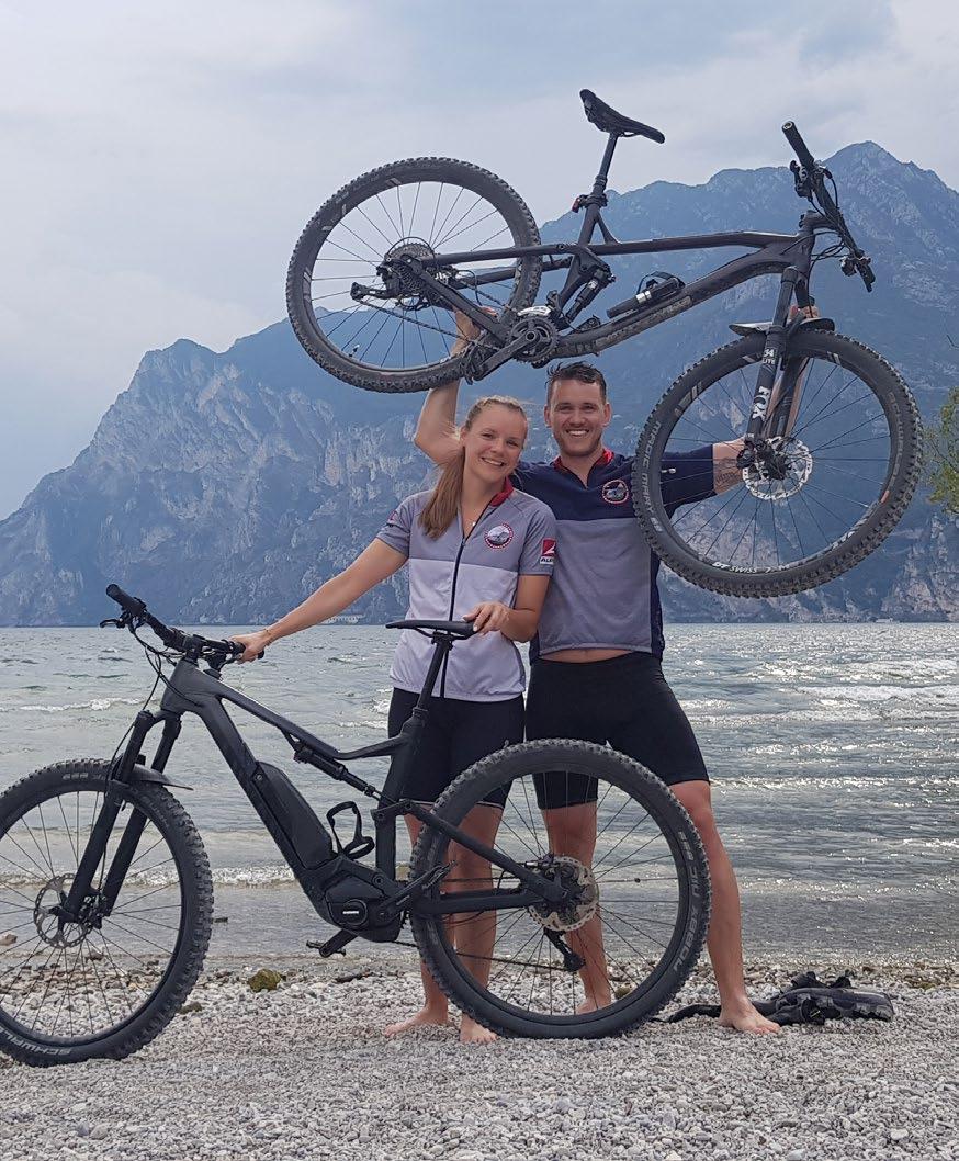 Gemeinsam das Ziel erreichen! Die Erfahrung beweist, das E-MTB bringt Partner beim Sport zusammen. Der eine über quert die Alpen per Muskelkraft, der Partner begleitet ihn per Pedelec. Nur in dieser Konstel lation machen wir bei bestimm ten MTB-Transalp Terminen eine Ausnahme und nehmen Pedelec-Piloten mit.