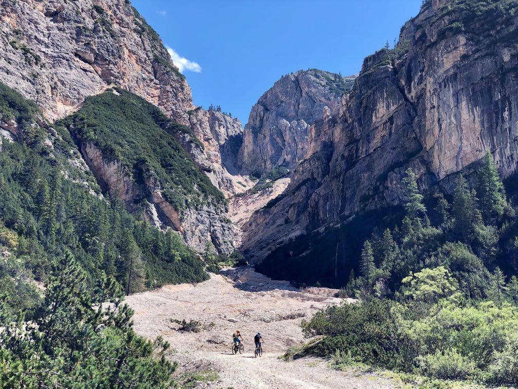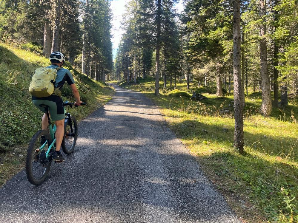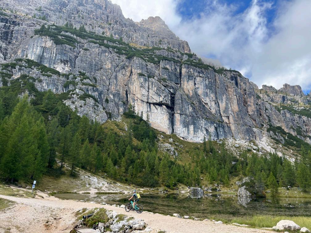 34 Kilometer und 1450 Höhenmetergeht das überhaupt? Ja, denn es bedeutet: Heute wird es steil! Schnell verlassen wir den Olympia Ort Cortina. Dafür genießen wir einen herrlichen Blick auf das Tofana Gebiet. Ein kleiner versteckter Weg führt uns nach Mortisa. Hier verschlingt uns der Wald und im morgendlichen Schatten treten wir die ersten Höhenmeter. Bis zur Mittagspause sind es gerade einmal 10 Kilometer. Vorbei am Lago D´ajal wird es nun zunehmend steiler. Die 300 Höhenmeter bis zur Cappuccino Pause auf der Malga Federa sind steil aber fahrbar. Oben angekommen werden die Strapazen belohnt. Eine herrliche kleine Malga mit tollem Blick auf die Ampezzaner Dolomiten und dem Punta Sorapiss erwartet uns. Von hier wird es italienisch steil. Die Schotterpassagen sind unwegsam und die Betonrampen kaum zu meistern.