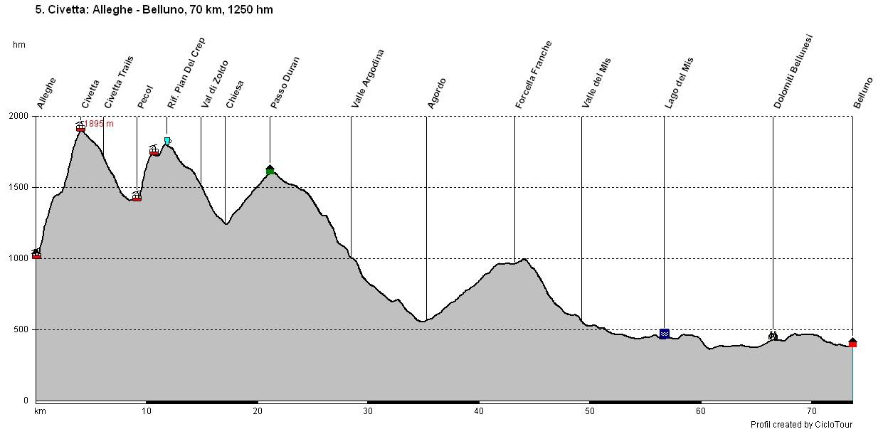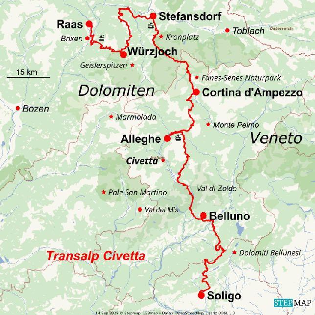 nehmen wir die Passstrasse. Wir verlassen diese abrupt und nun startet ein super Downhill Trail bis nach La Valle Argodina. Wir wechseln nun die Talseite und überqueren den Torrente Cordevole, der sich tief in die Schluchten seinen Weg gesucht hat. Nun heißt es Strecke machen. Schließlich wollen wir heute noch bis Belluno. Deshalb treten wir nun einige Kilometer Asphalt um über das Valle del Mis und den gleichnamigen See zu erreichen. Über kleine versteckte Wege erreichen wir am späten Nachmittag unser Stadthotel in Belluno. Ein langer Tag geht zu Ende.