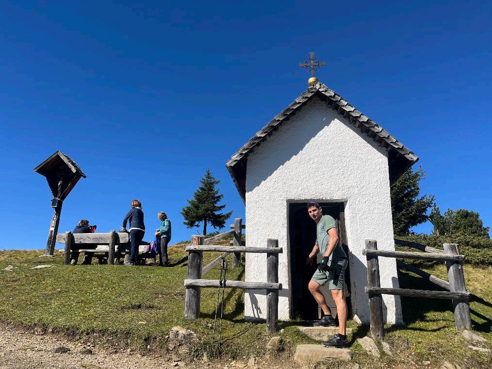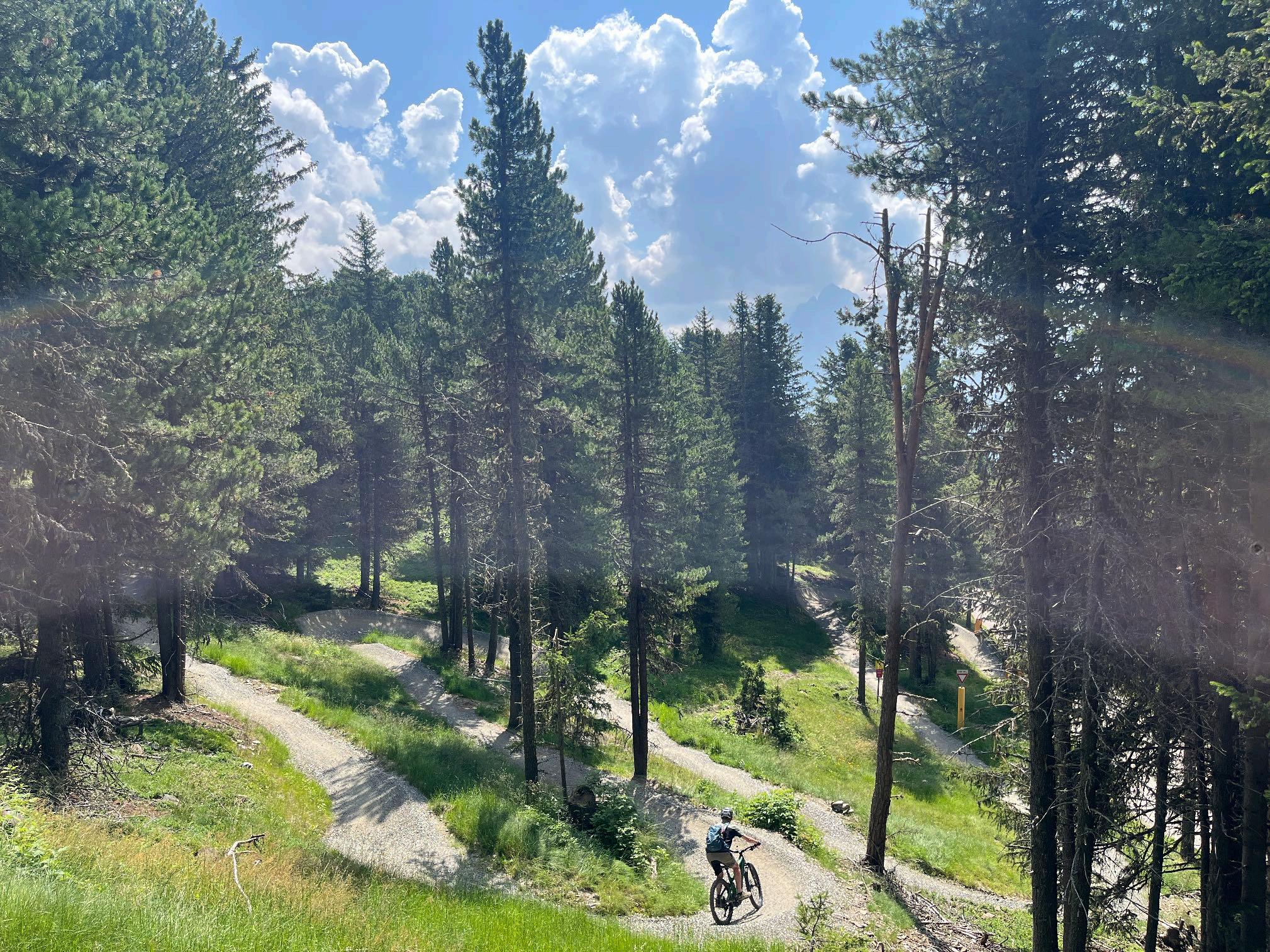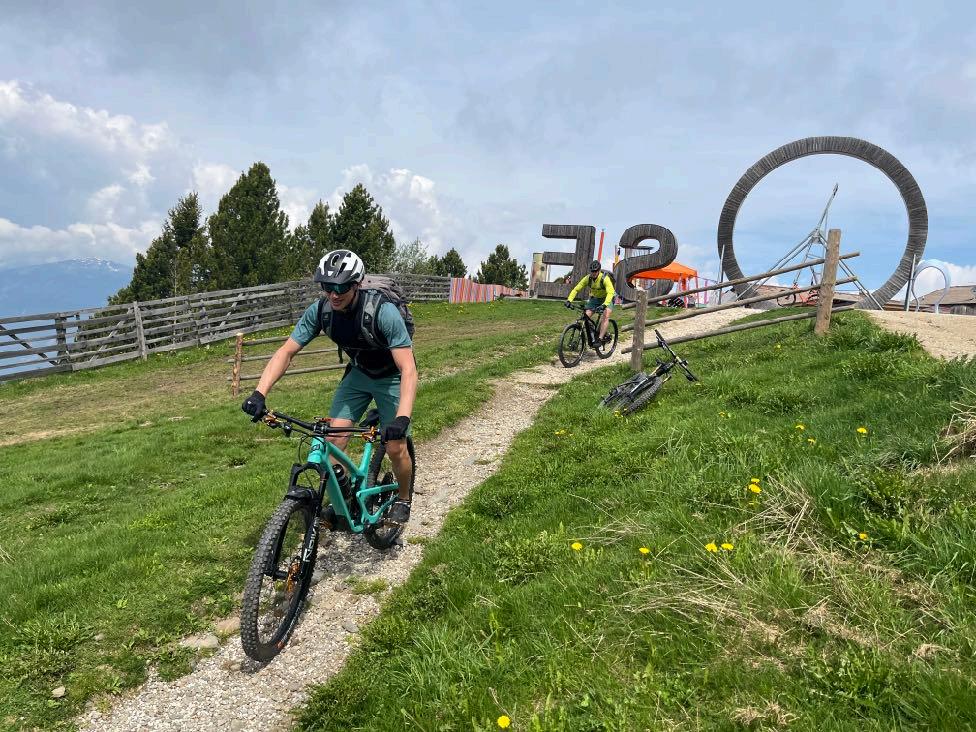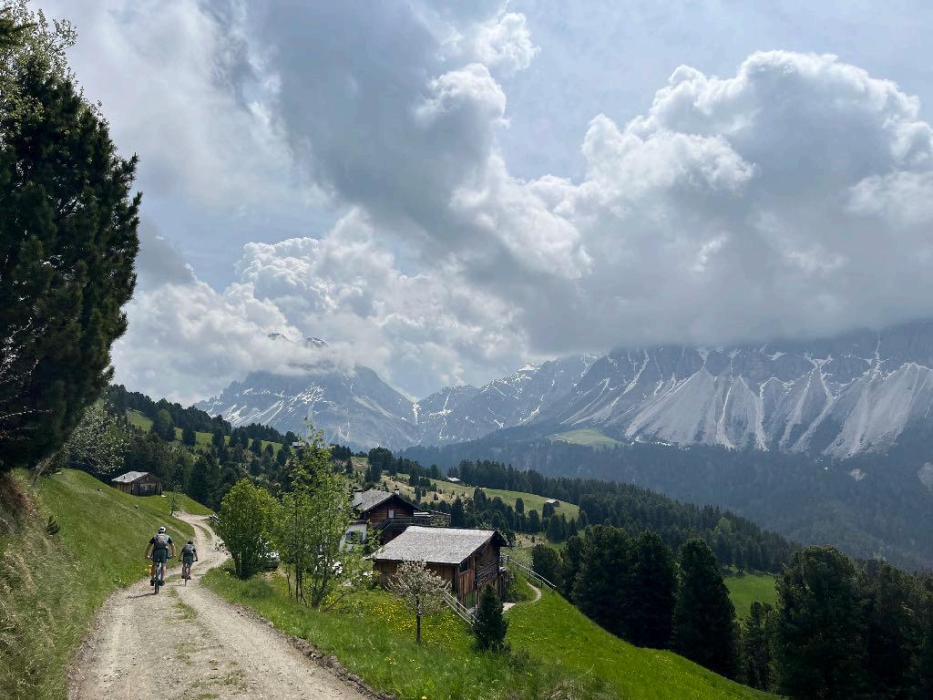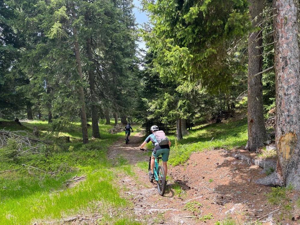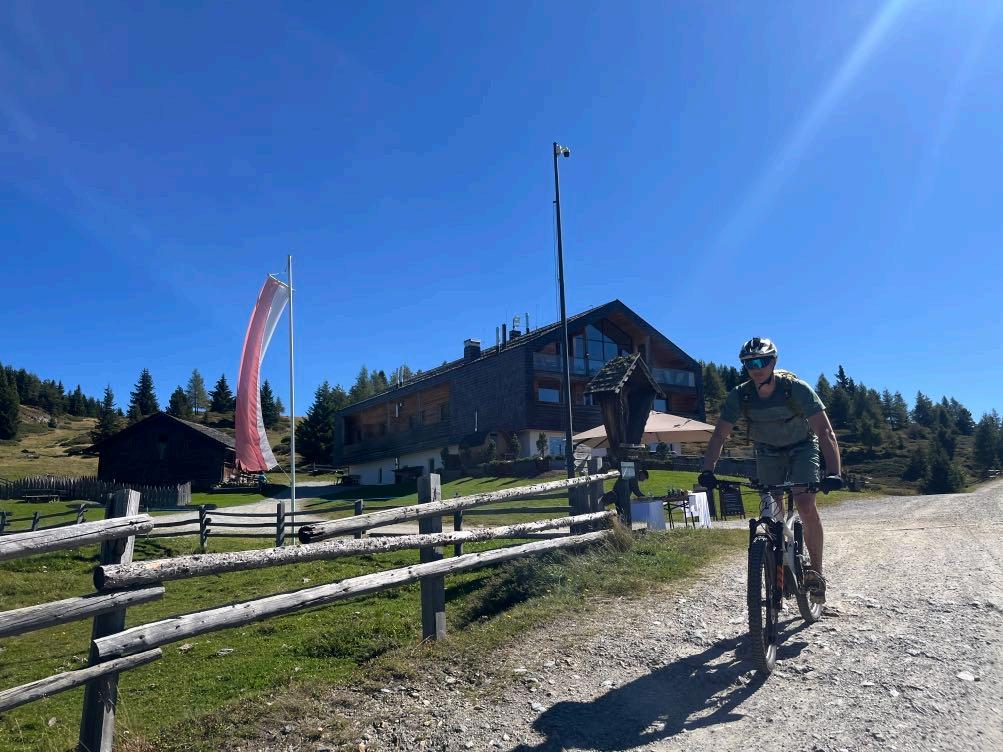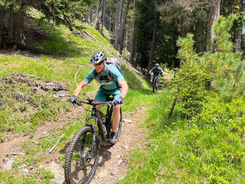 Stubaital, in die Zillertaler Alpen, dem Alpenhauptkamm, das Ahrntal, zum Kronplatz, in die Fanesgruppe bis hin zur Marmolata und Großglockner. Das Lüsner Almen Hochplateau wird von uns komplett ausgefahren. Am Astjoch angekommen freuen wir uns auf eine Stärkung. Die Mittagspause genießen wir auch heute wieder in der Höhe. Der Großteil der Höhenmeter liegt glücklicherweise auch bereits hinter uns. Über 2000 Höhenmeter geht es heute bergab. Gut gestärkt starten wir in den Downhill. Dieser führt weitesgehend durch den Ehrenburger Wald. Wir sind nun im Pustertal angekommen und kurbeln die letzten Höhenmeter auf ruhigen Wegen Richtung Hotel in Stefansdorf.