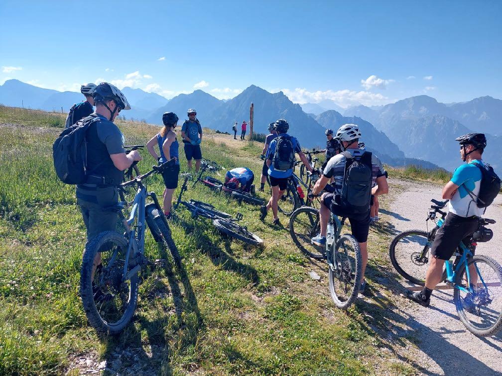 1000 Höhenmeter auf 10 Kilometer bis zur Mittagspause. Zunächst auf einem kleinen Asphaltsträßchen die ersten Höhenmeter ansteigend, später dann ein schöner Waldweg. In nur wenigen Abschnitten steil. Die folgende Asphaltstraße ist schmal und steil. Gut 300 Höhenmeter bis zur Cappuccino Pause. Danach weitere 250 sehr steile Höhenmeter. Italienische Betonplatten wenn es besonders steil wird. Nach der Mittagspause nochmals 250 Höhenmeter im Trail bergauf. Diese sind gut zu fahren, die Höhe muss man jedoch einkalkulieren. Trails auf knapp 2300 Metern Höhe. Die Abfahrt von der Forcella beginnt spektakulär. Ein schmaler Weg führt uns durch Wiesen- und Felsenlandschaften. Gut 150 Tiefenmeter sind hier sehr technisch. Weiter bergab über Wurzeltrails bis fast nach Pescul. Oberhalb von Alleghe zunächst steil auf Schotter hinunter. Die Alleghe Trails liegen nachmittags im Schatten, sind teilweise steinig und führen teilweise durch die Vorgärten der Anwohner. Aus diesem Grund fahren wir auch mal Schritttempo.