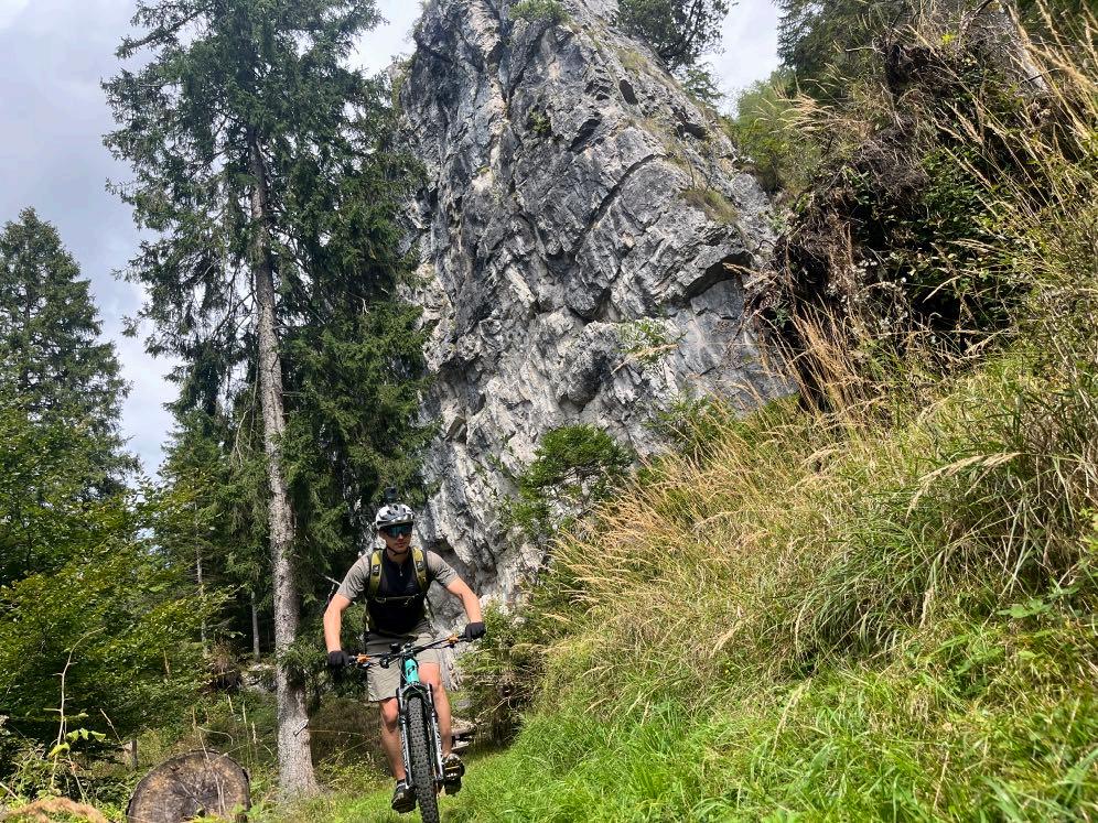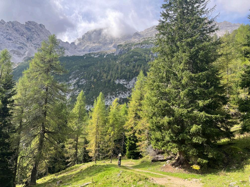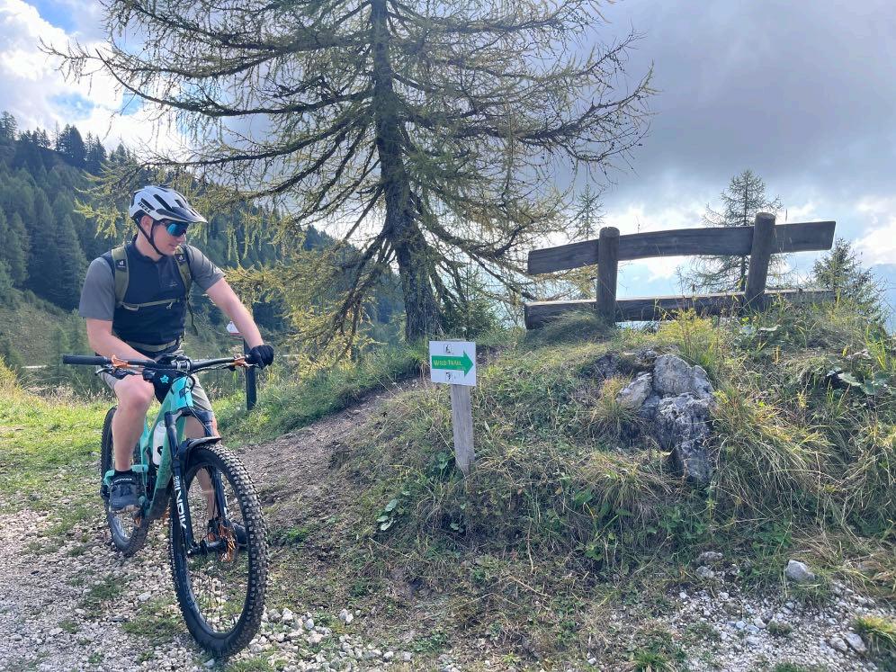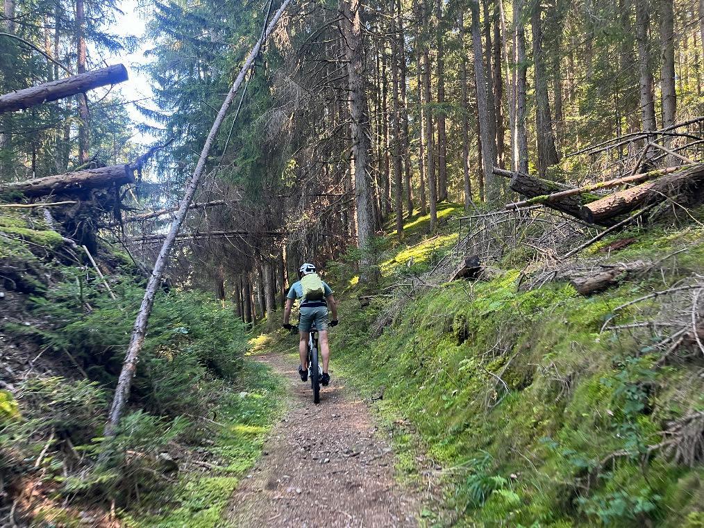 Trails, Trails, Trails: Wir starten direkt mit einem steilen Waldtrail hinunter bis zum Parkplatz Maurerberghütte. Der Trail kann in Abschnitten noch feucht sein. Nun auf Forstweg hinauf zur Hütte. Nach der Hütte beginnt ein langer Trail auf über 2000 Meter Höhe. In Summe werden hier auch ca. 200 Höhenmeter bewältigt. Der Trail ist oft sehr gut fahrbar und nur wenige Passagen müssen geschoben werden. Ab dem Astjoch sind die Höhenmeter gemeistert. Über eine Schotterabfahrt gelangen wir zur Starkenfelder Hütte. Nun über Wiesenwege und Waldtrails hinunter ins Pustertal. Durch den Borkenkäfer bedingt, müssen wir auch ein paar Tiefenmeter auf einem Forstweg hinunter fahren. Der Waldtrail ist teilweise steil aber vom Untergrund her super zu fahren. Immer wieder queren wir den Forstweg. Ein letzter Offroad Abschnitt bringt uns nach Ehrenburg im Pustertal. Nun über ruhige Wege bis nach Stefansdorf.