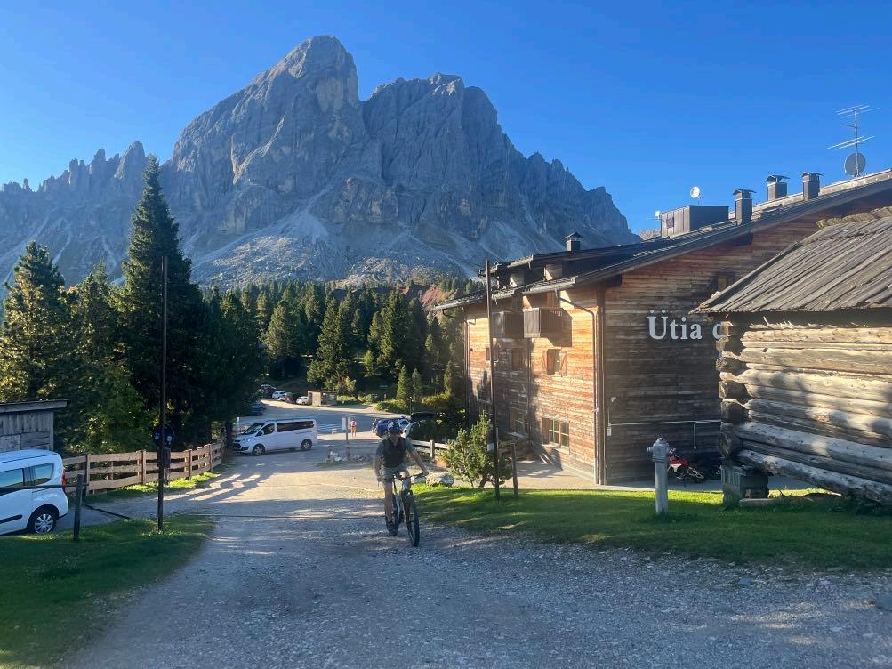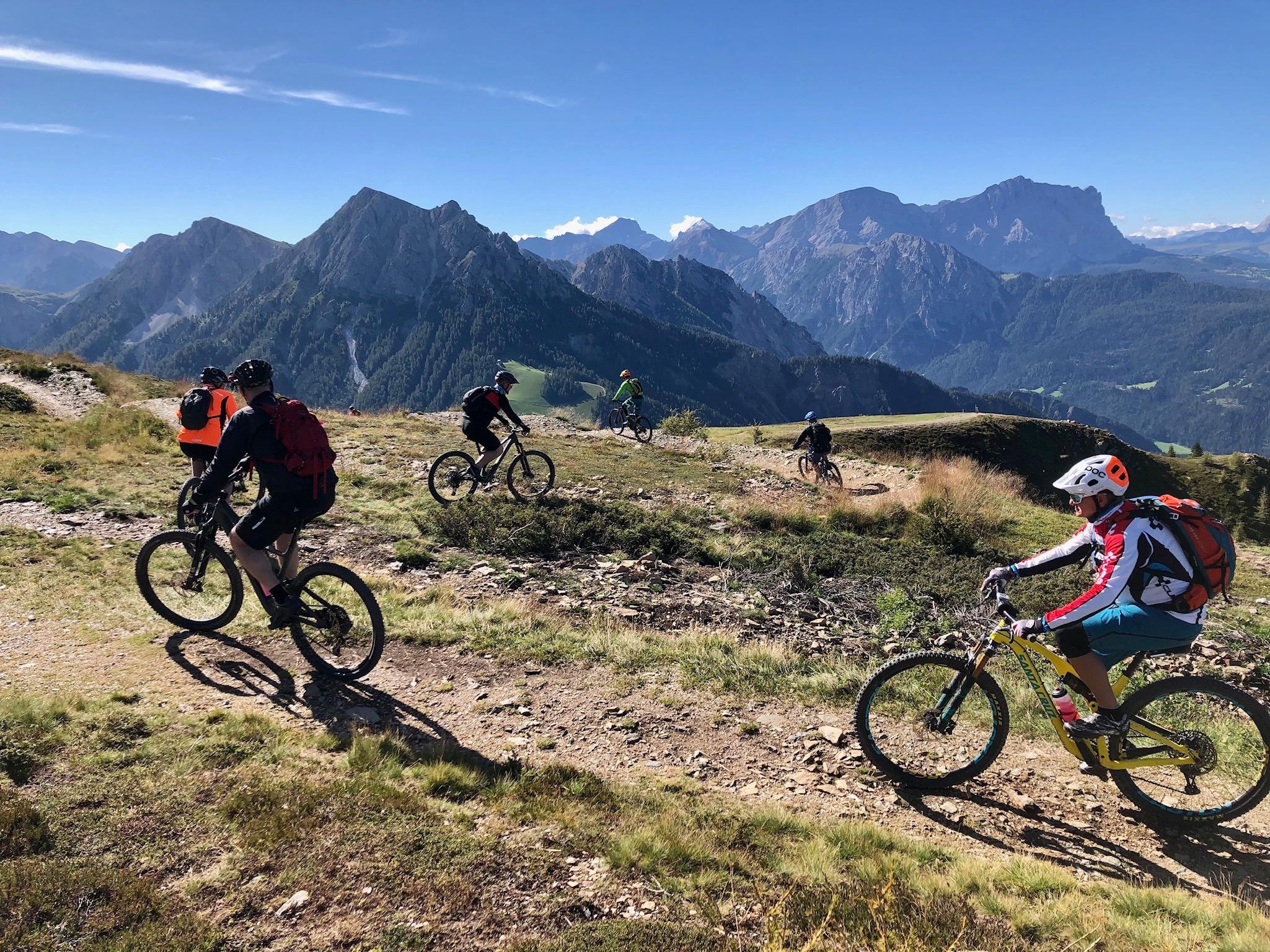Nach der Cappuccino Pause nehmen wir einen ersten gebauten Biketrail unter die Stollen. Hier wird der Guide auch nochmals wichtige FahrtechnikSkills weitergeben. Über den folgenden Höhenweg unterhalb vom Gabler erreichen wir eine herrliche Mittagsrast. Face to Face mit den Dolomitengipfeln. Am Nachmittag führt der Weg überwiegend ansteigend hinauf zu unserer Übernachtung auf der Würzjochhütte, direkt am Würzjoch auf über 2000 Meter. Ein ganz besonderer Abend erwartet uns.