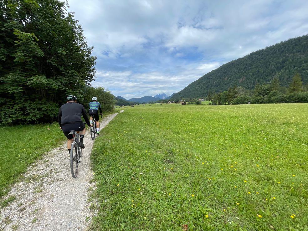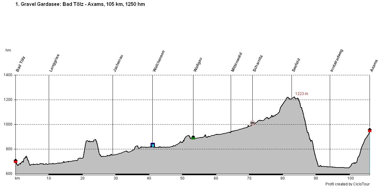 Gravelbike Transalp Lake Garda 1. stage - 105 km - 1400 m elevation gain from Bad Tölz to AxamsOur Gravelbike Transalp starts in the classic way in beautiful Bad Tölz on the northern edge of the Alps. We first roll gently along the Isar towards Lenggries. We can already see the Benediktenwand and the Brauneck ski resort. Passing Wegscheid, we struggle a little through the Isar gravel. So the transalp can go on.